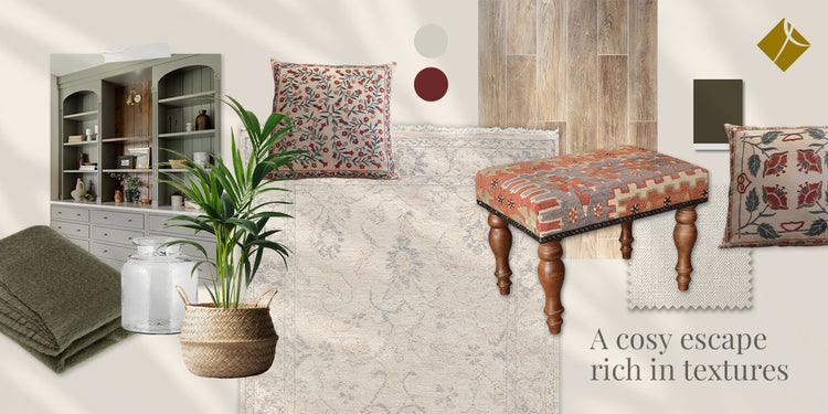 Mixing soft, handmade rugs with practical modern furniture makes the space feel cosy and easy to live in. Artisan rugs and subtle patterns soften modern spaces and help create a lounge that feels inviting, grounded, and effortlessly charming.