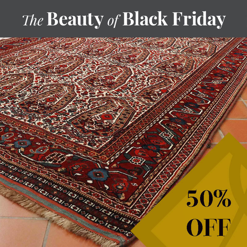 The Qashqai designs are not written or drawn; they are passed down to daughters who watch their mothers from an early age and gradually develop their skills in a family environment. The women will make these pieces with two or even three generations involved. The work is knotted by the weavers sitting cross-legged on the floor and the carpet whilst they craft their art. Meanwhile, the men and boys will defend and protect the animals. The traditional lozenge-shaped ground, with medallions in the centre repeated in the corners, often includes many birds, animals, flowers, and trees that they see around them. Occasionally, if you are very fortunate, you will come across one with the horse head of Persepolis. As you would expect, these carpets are hand-knotted from wool that is largely vegetable-dyed. The Kashgai pieces often have an interesting selvedge with bi or tricolour windings like a barber pole. The other distinctive characteristic is that the rug will be knotted on a wool foundation.