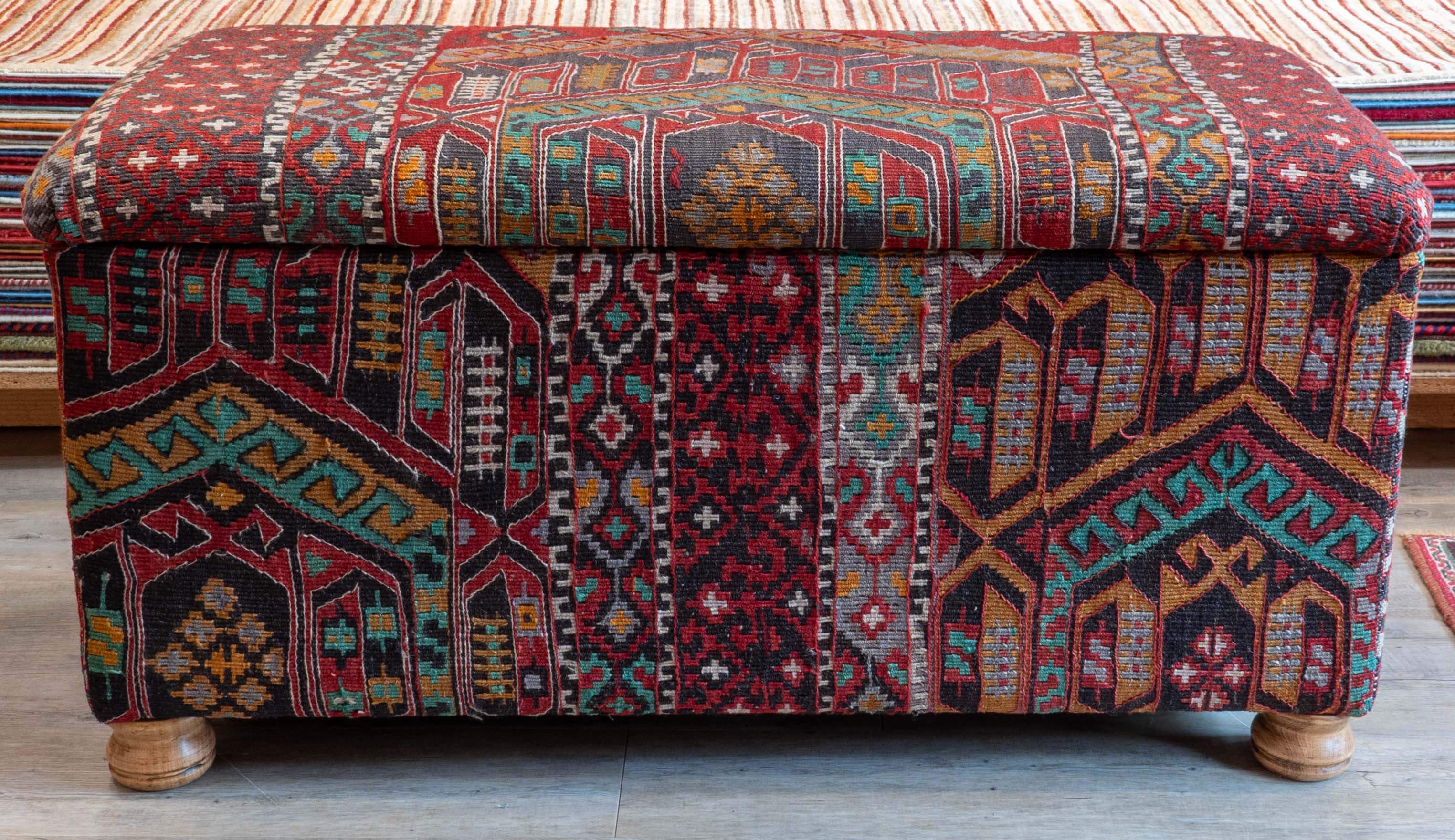 We are delighted to find this very old Kilim, which has had many years to achieve this fabulous look. It is 80 -100 years old. So being able to repurpose it in such a way as to preserve it for perhaps another 100 years is exciting and environmentally sensible. We had sufficient usable Kilim for two ottomans and a Chair. We might even get a couple of cushions.