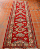 Although Kazaks are traditionally hand-knotted in Afghanistan, the design originates from the Caucasus. The short pile emphasises the sharpness of the design. Each piece is made from Afghan wool, often spun in Ghazni. Afghan wool is generally slightly coarser and more curly than other wools and is excellent for carpet weaving. Afghan Kazak carpets are usually made using bold geometric designs in strong, vibrant colours, such as rich reds, warm terracotta, shades of blues, and soft golds and creams.