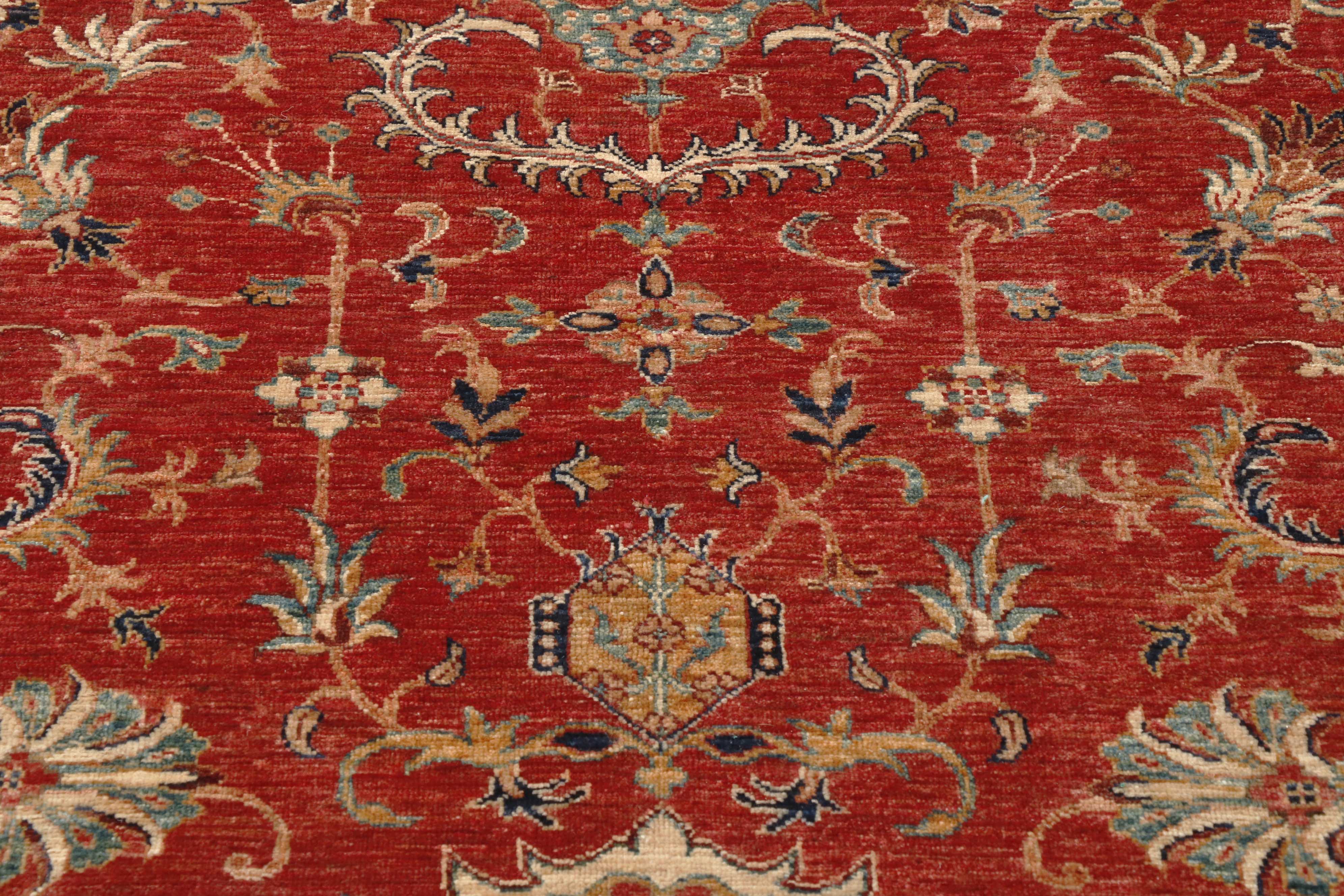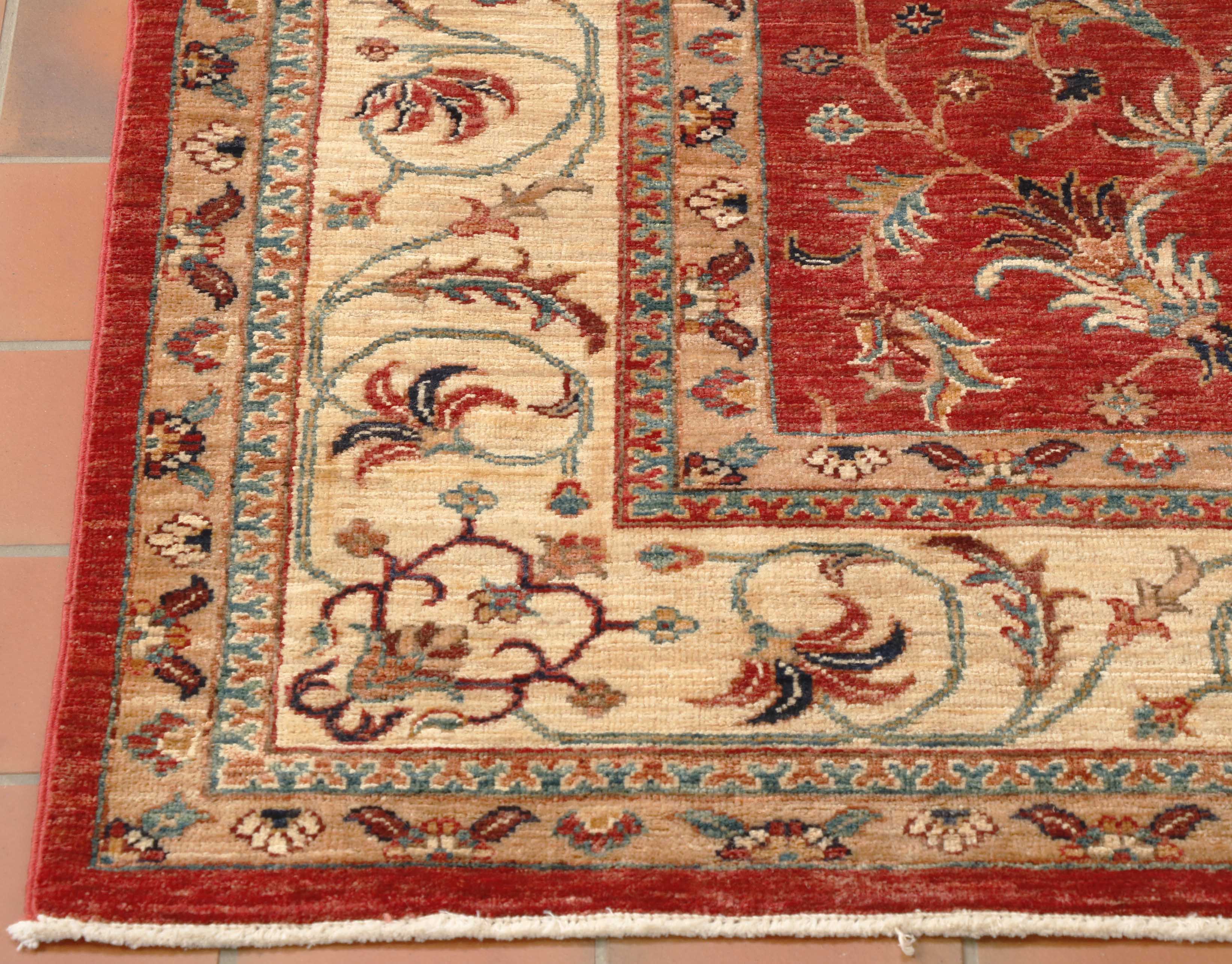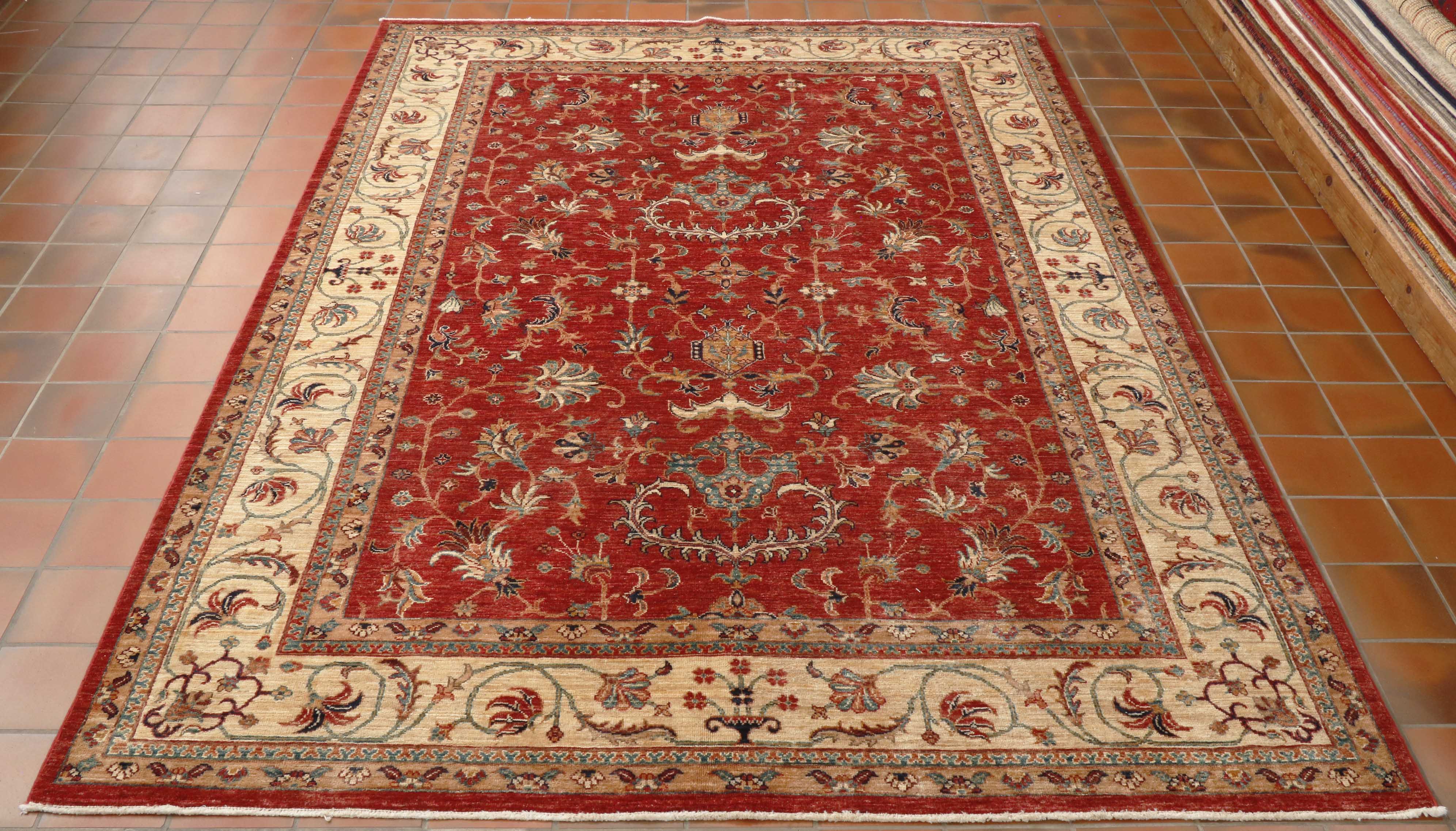 The tomato-red background and cream border make this a light-coloured rug overall, but the red imparts a rich warmth. The classic pattern is pleasing to the eye, featuring a simple curvilinear border. This rug is of superb quality and practical for any room in the home. Please click the hyperlinks in Gold if you are interested in additional information. Afghan Aryana rugs are hand-knotted in Mazar-e-Sharif and Kabul, Afghanistan, often featuring designs inspired by museum pieces. Woven from long wool sheared from Karakul sheep, the wool is washed with a gentle soap and water, then hand-combed and hand-spun on a spindle. Next, the wool...