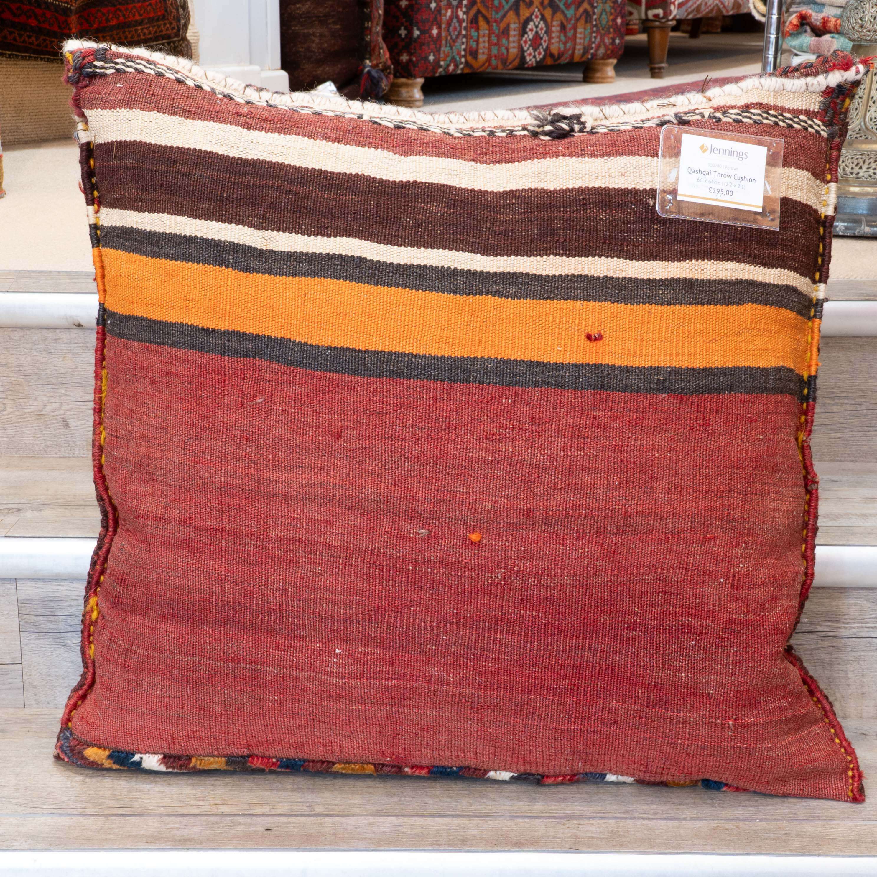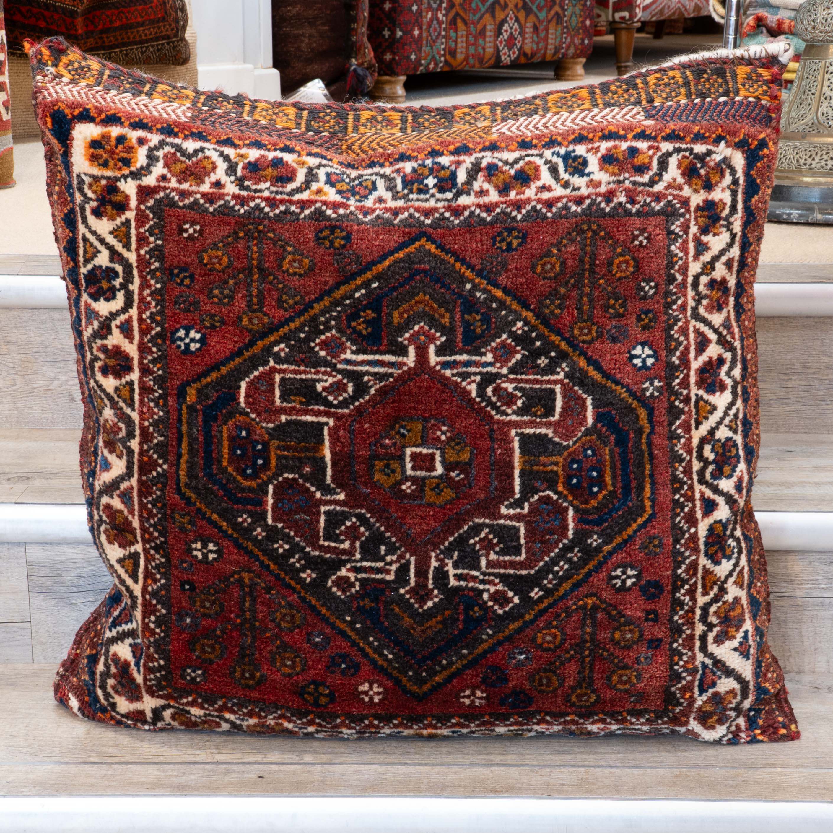 This is a handmade Qashqai cushion with traditional nomadic colours and designs. The wool is handspun and dyed with natural dyes derived from fruits, flowers, spices, nut shells, and tree bark. One side of the cushion features a thick plush pile, and the other features a striped kilim flatweave. The design features a central diamond medallion surrounded by stylised flowers and birds.