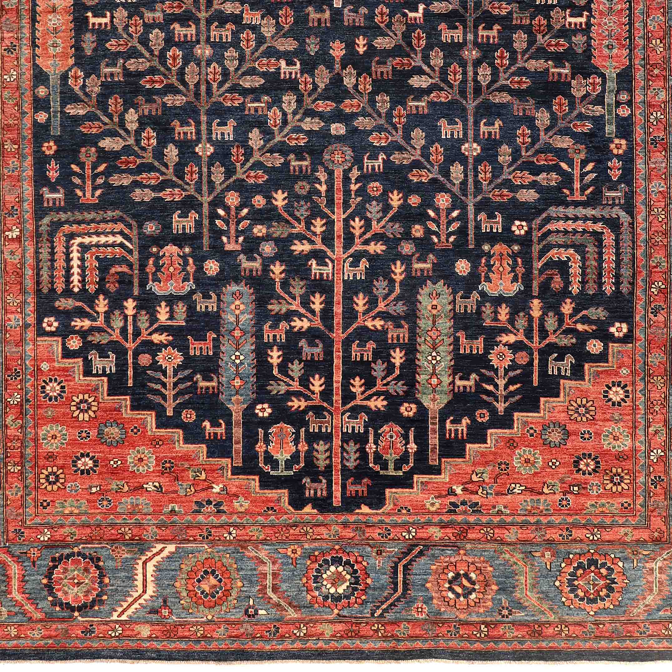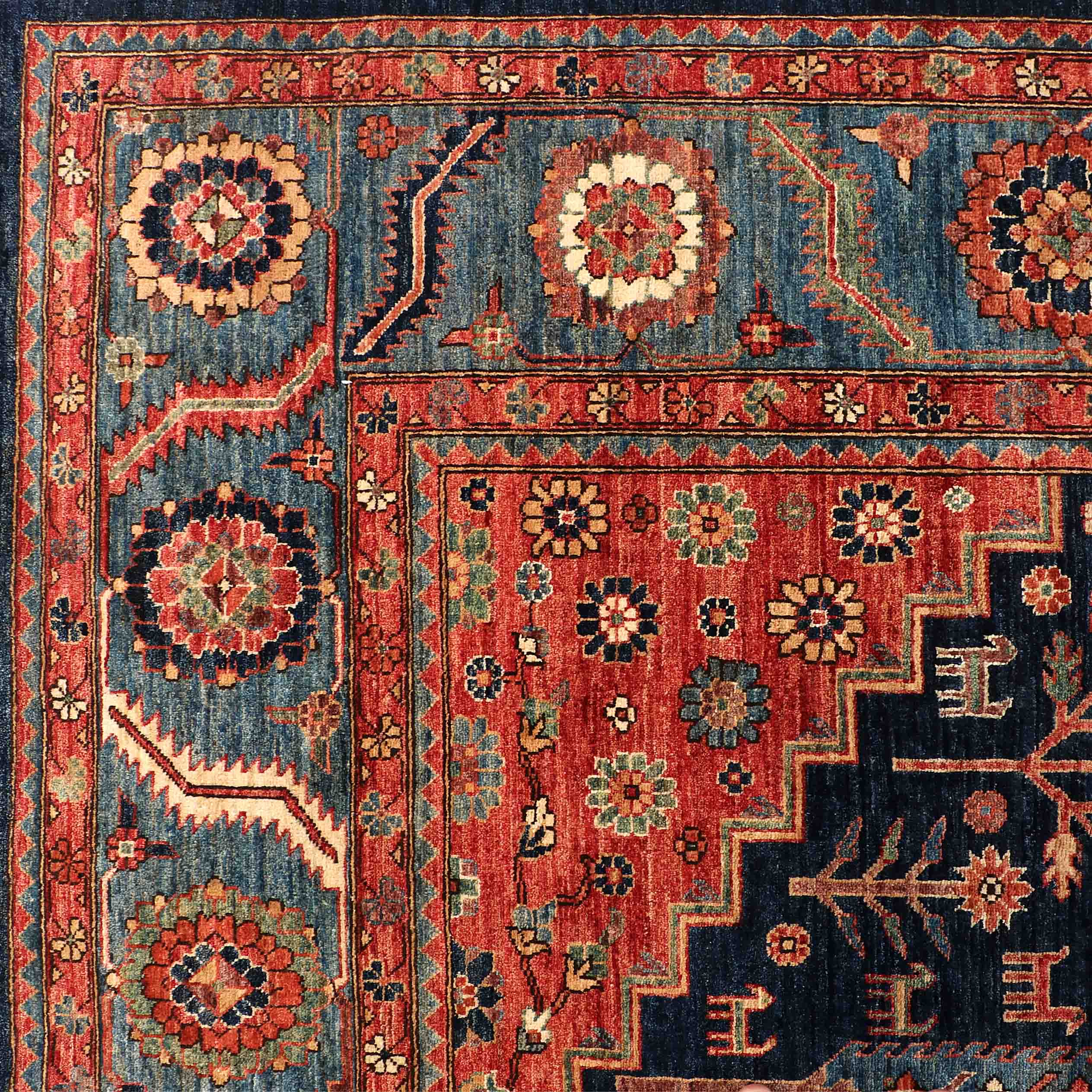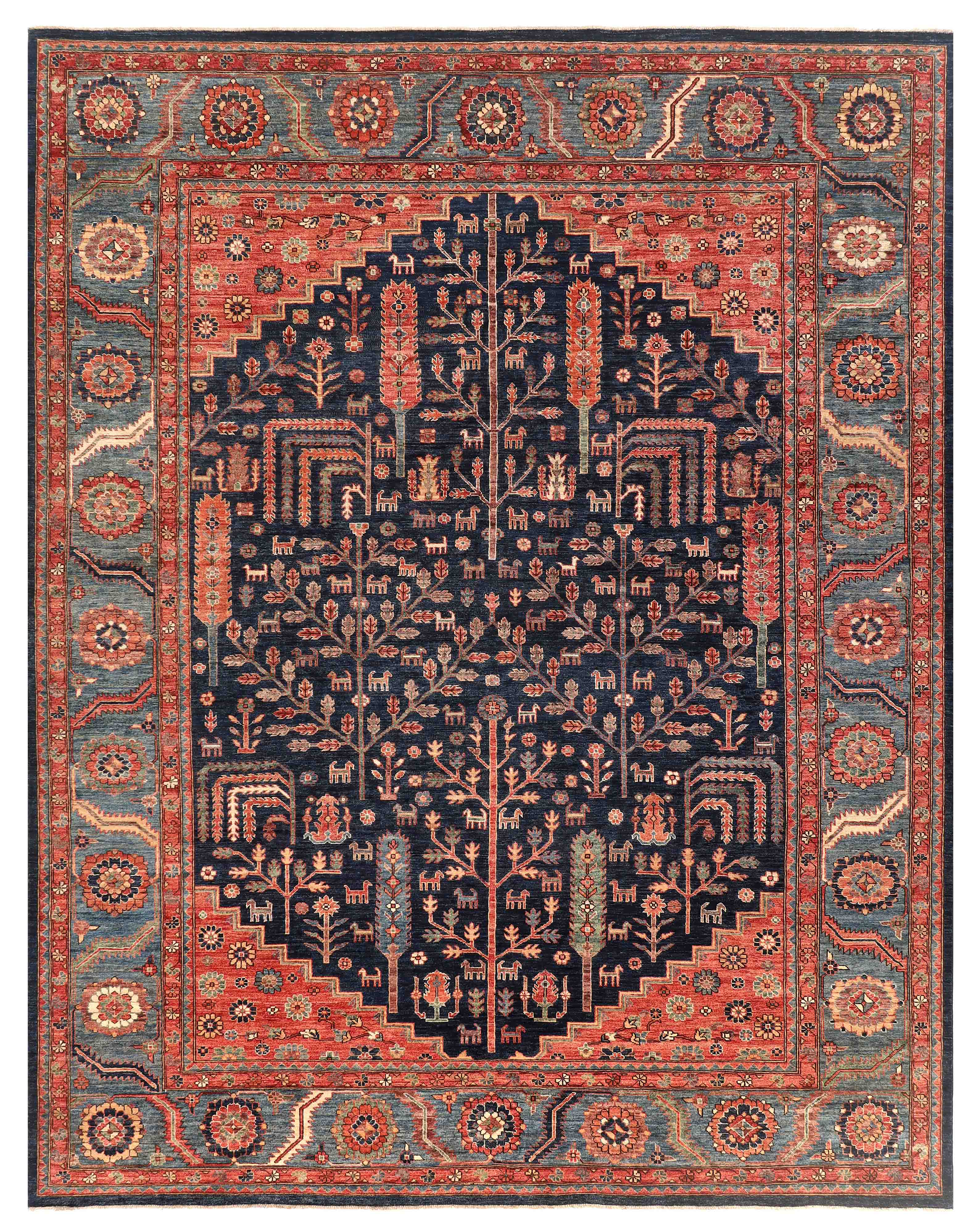 This unique and varied collection, produced in northwest Afghanistan, has a construction similar to that of the Ziegler rugs. The wool is sheared by hand from the indigenous Karukal sheep. It is then handspun and coloured using natural vegetable and mineral dyes. These pieces have utilised attractive old Persian designs and patterns from unusual museum pieces. They are generally more vibrant colours and less muted shades. However, the exciting and uplifting colours remain almost Jewel-like. The final finishing processes are carried out in Pakistan, where some post-production occurs, including alignment corrections, surface clipping and tumbling, and the washing mentioned earlier.