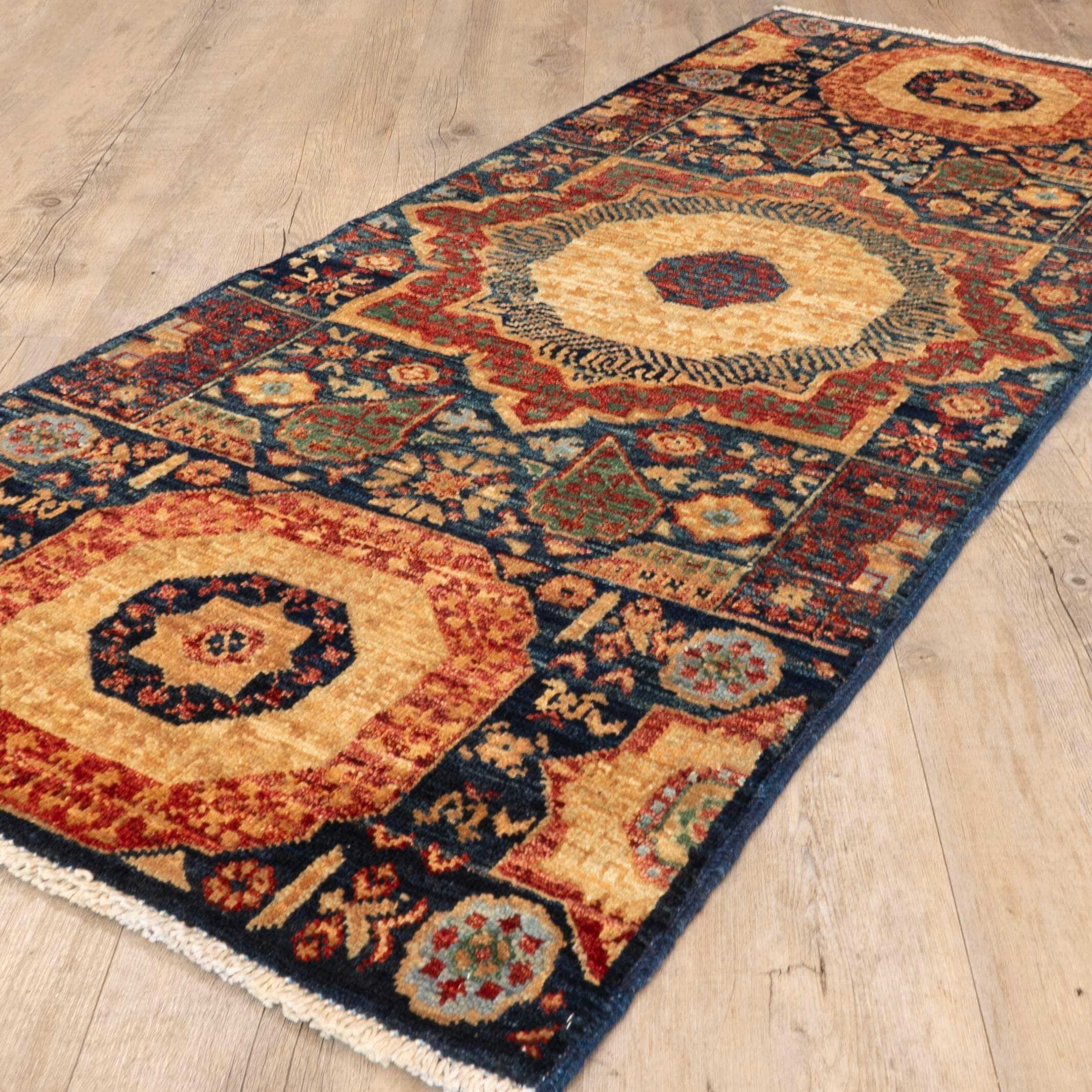 Skilled artisan weavers craft this short runner, a masterpiece of the traditional cottage industry. It will surely bring timeless elegance to your hallway, corridor, or landing. The vegetable-handspun wool is hardwearing and practical, while the classic navy blue, red, and gold medallion design lends a luxurious, exclusive feel. This beautiful runner will add an air of sophistication to any home.