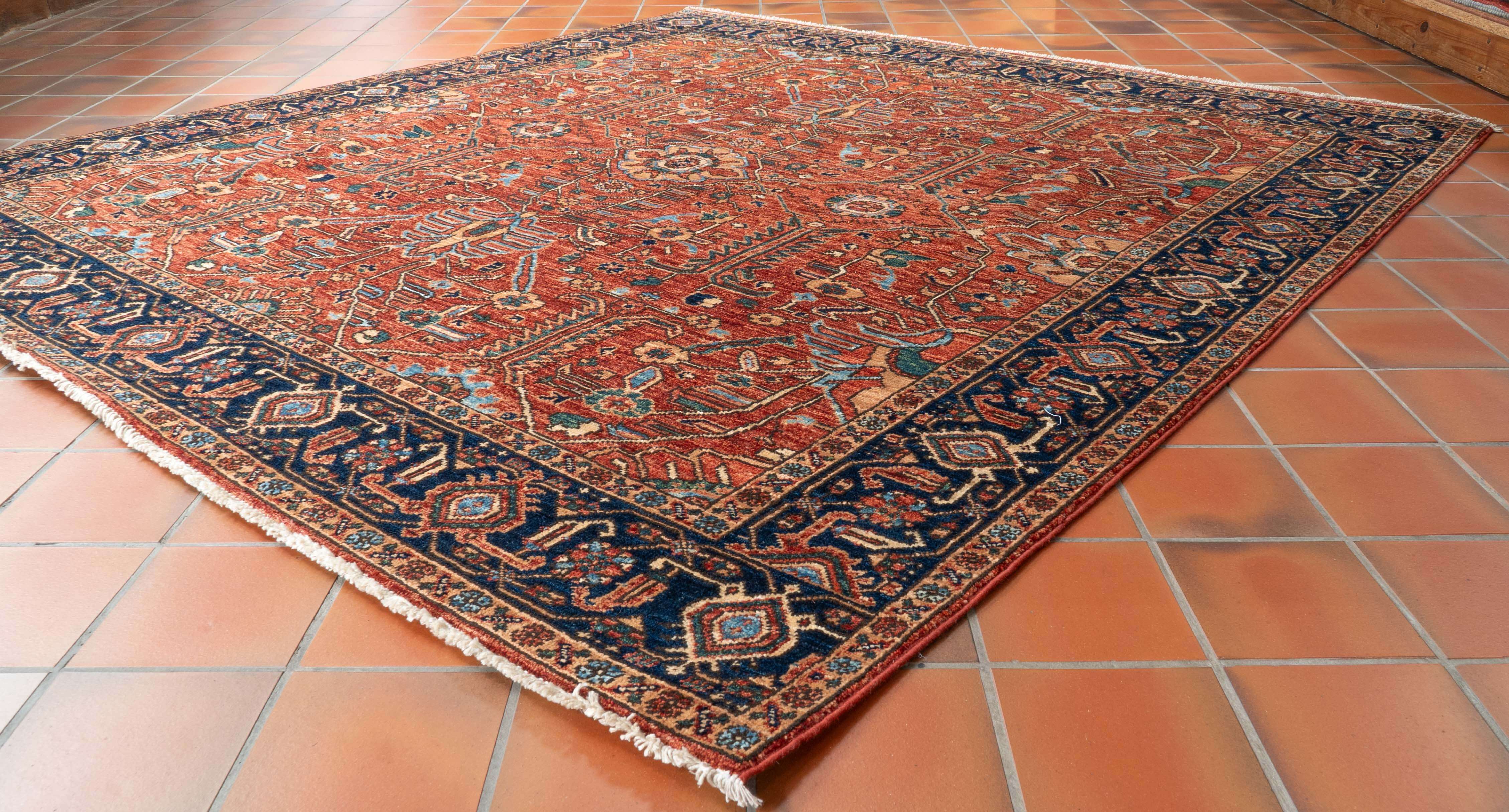 Enhance your living space with this distinctive handmade Afghan Choeb Rang rug, featuring an all-over design with character and charm. The harmonious blend of warm terracotta and navy blue, coupled with the durable wool construction, ensures lasting quality. Elevate your décor with a piece that combines artistic uniqueness and enduring craftsmanship, moving beyond the ordinary to bring a sophisticated touch to your home. Please click the hyperlinks in gold if you are interested in additional information.This unique and varied collection is produced in northwest Afghanistan and has a construction similar to that of the Ziegler rugs. The wool is hand-sheared from the...