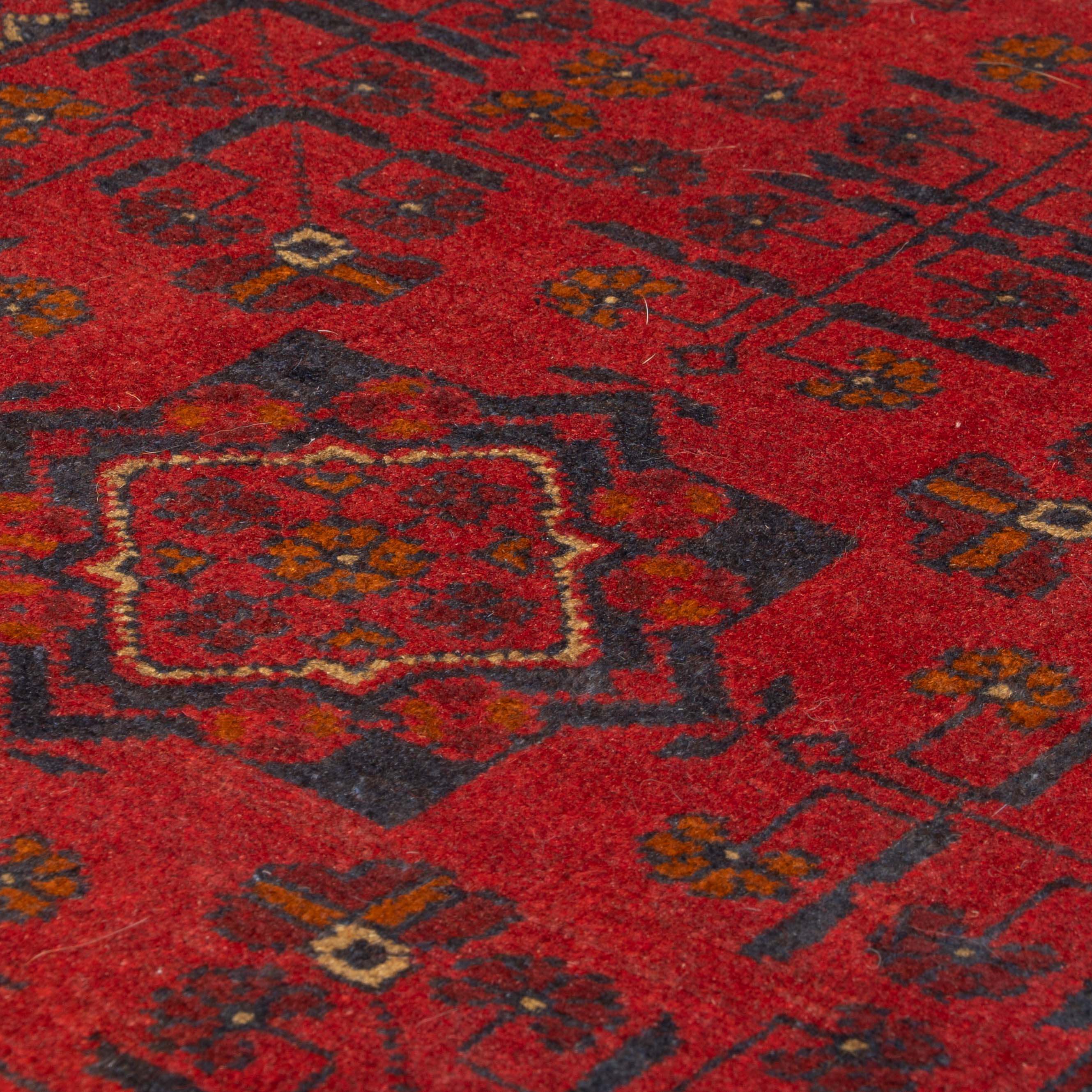 Why not treat yourself to a work of art with this rich, warm, handmade Afghan Khal Mohammadi rug? Its traditional design features a classic red background with a stunning dark blue design crafted from pure wool on wool and coloured with natural vegetable dyes. This authentic piece adds a touch of history and craft to your home.