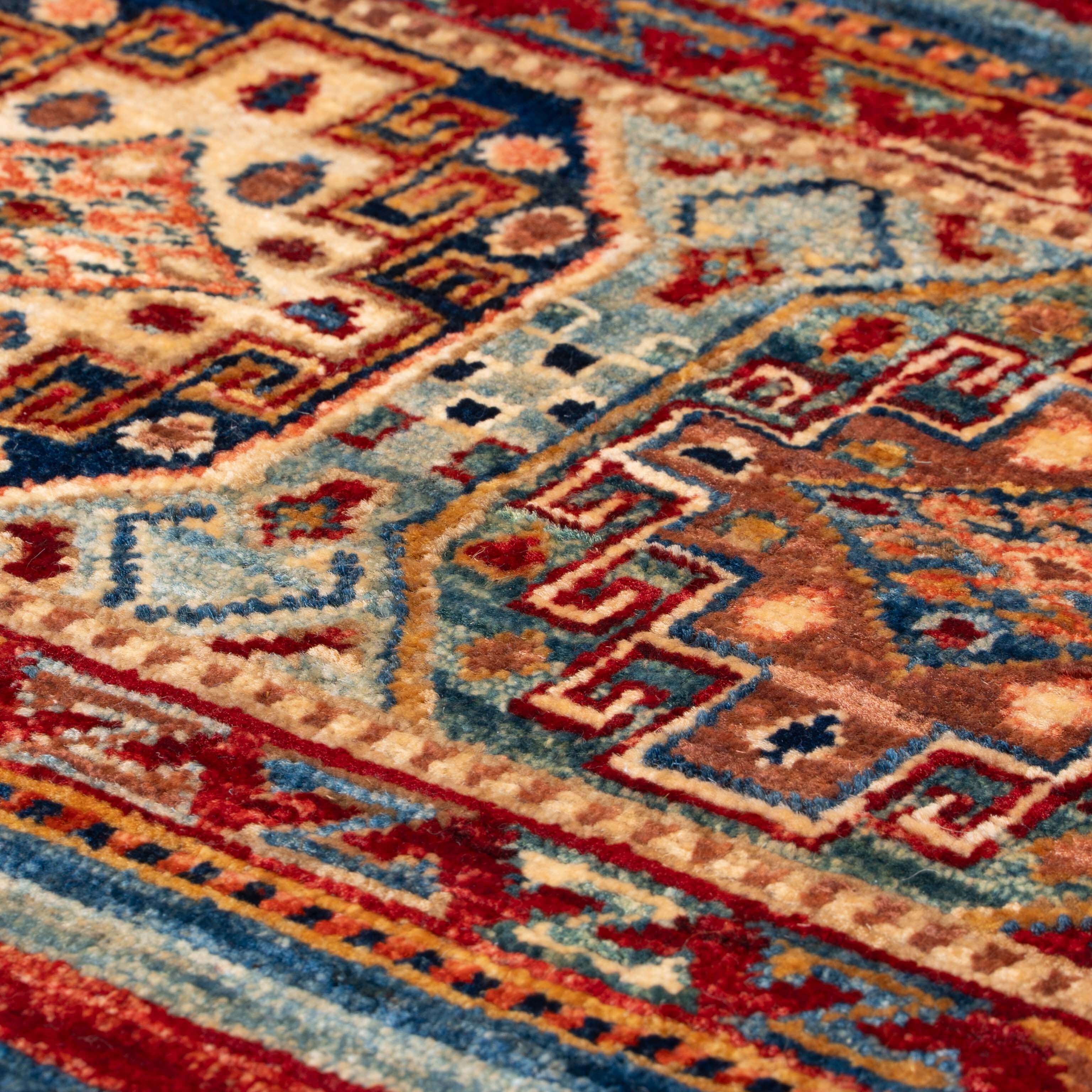 Kharjeen (Khorjin) rugs, runners, and carpets are still hand-knotted, and the wool is dyed with vegetable dyes. The Kharjeen (also known as Khurjeen) rug designs can be reminiscent of Gabbeh designs. The colours of the Kharjeen rugs and carpets are similar in many ways to those used in our Samarkand and Loribaft collections. Some Kharjeen pieces do not have fringes and are finished with a plain kilim end or binding secured to prevent fraying. The other rugs are generally produced like the Samarkand carpets with an unusual bobbin wind on the warps.