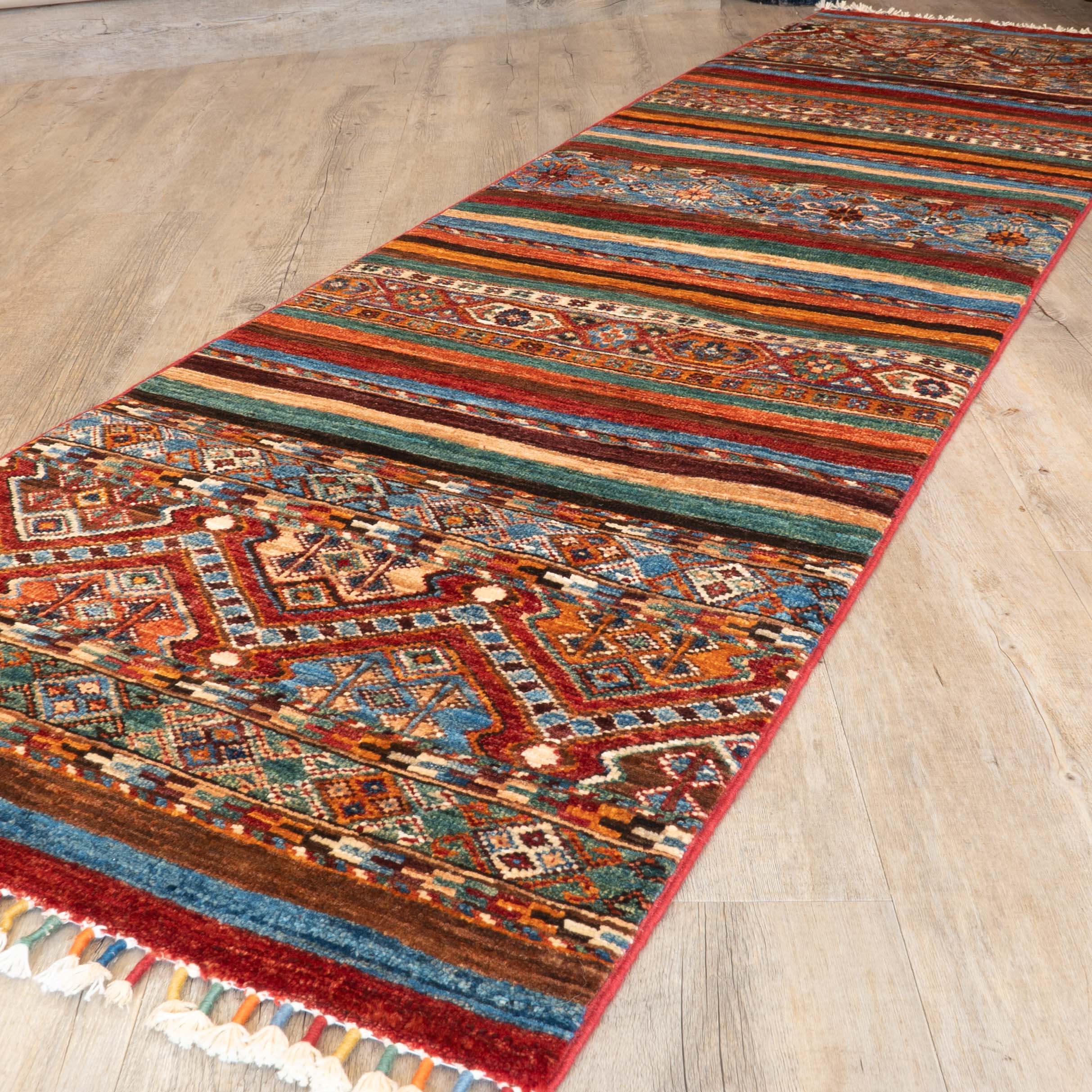 Handcrafted by skilled artisan weavers in north-west Afghanistan, this medium runner showcases generations of traditional weaving heritage. Produced within family cottage industries, each piece combines time-honoured techniques with contemporary design sensibility—blending vibrant kaleidoscopic colour palettes with understated plain stripes. Built to withstand daily wear, this authentic Kharjeen runner marries practical durability with the distinctive character of genuine handmade craftsmanship.