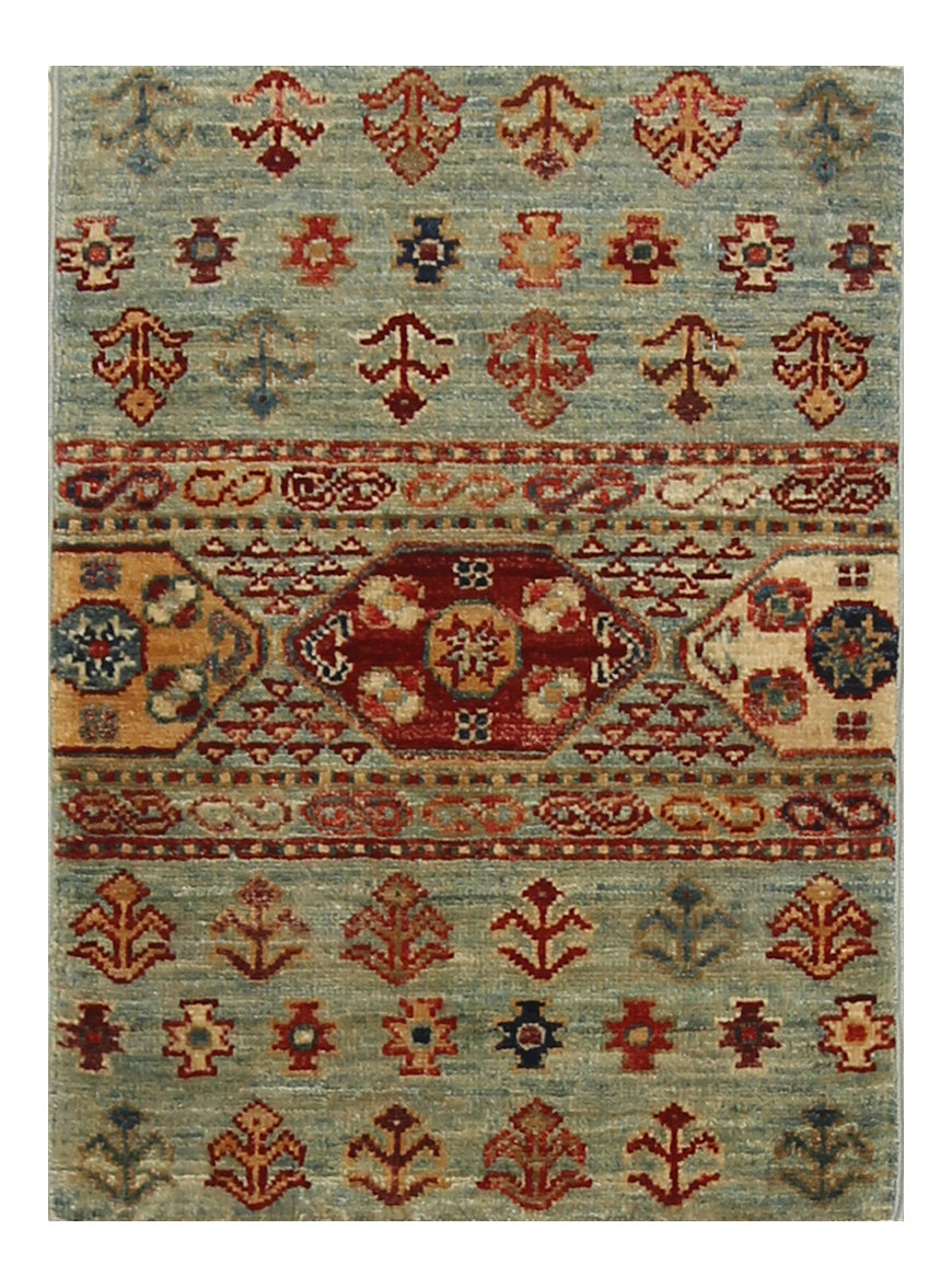 Kharjeen (Khorjin) rugs, runners and carpets are still hand-knotted, and the wool is coloured with vegetable dye. The Kharjeen (also known as Khurjeen) rug designs can be reminiscent of Gabbeh designs. The colours of the Kharjeen rugs and carpets are similar in many ways to those used in our Samarkand and Loribaft collections. Some Kharjeen pieces do not have fringes and are finished with a plain kilim end or binding secured to prevent fraying. The other rugs are generally produced like the Samarkand carpets with an unusual bobbin wind on the warps.