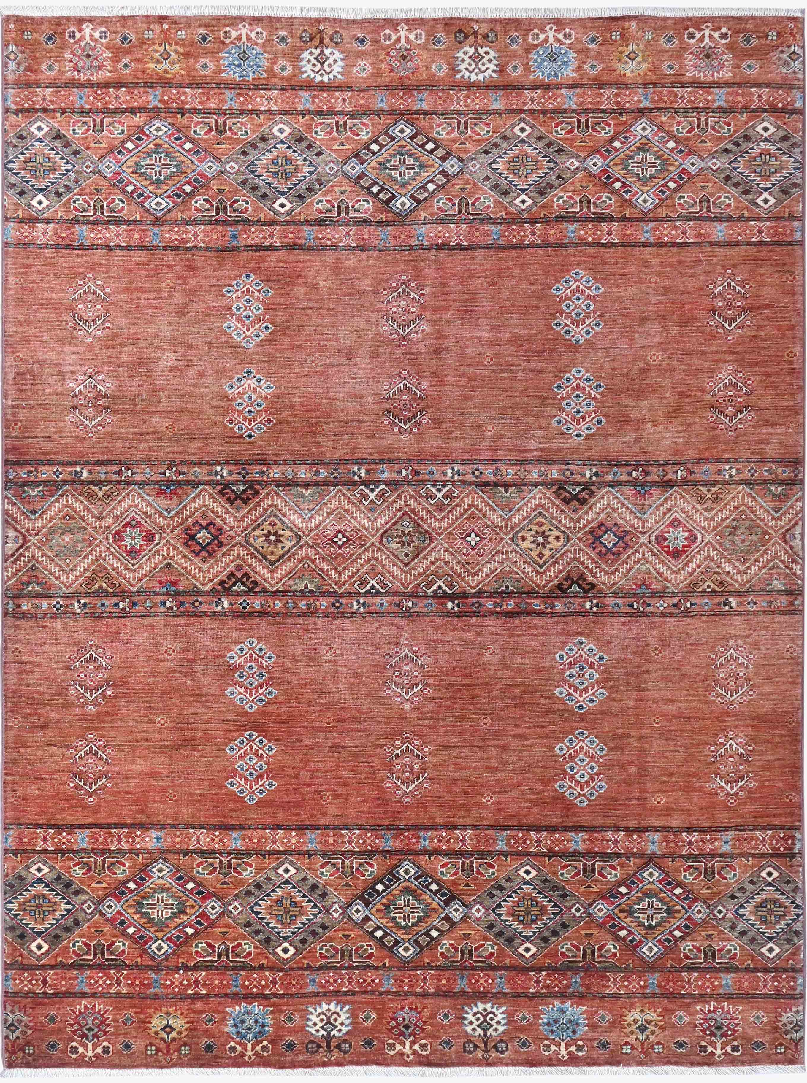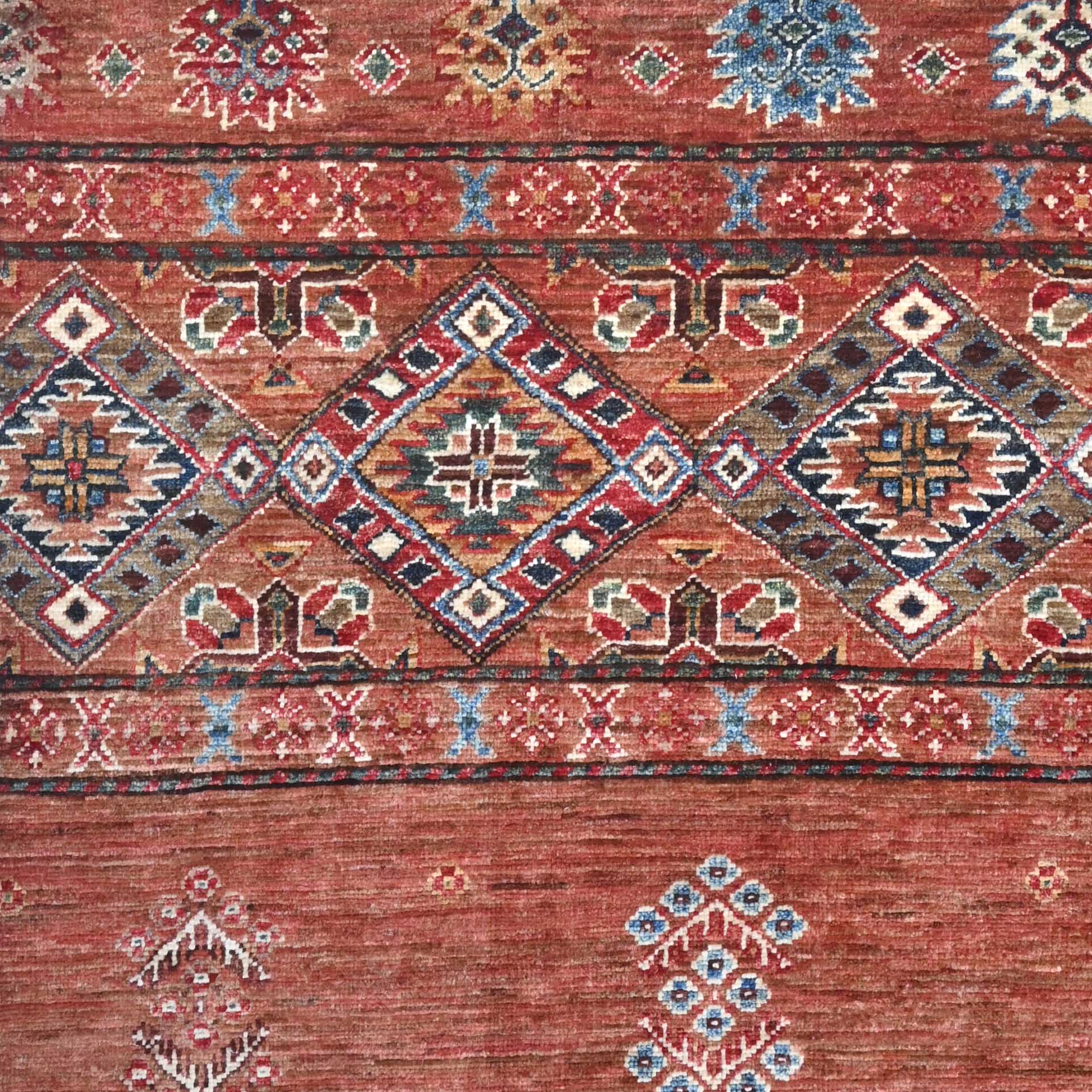 This handmade Afghan Kharjeen rug is crafted in northwest Afghanistan by skilled artisan weavers who preserve traditional techniques passed down through generations. Using vegetable-dyed, handspun wool, the rug features a warm terracotta background, with a contemporary design that blends with traditional motifs. Its durable, hardwearing construction ensures practicality while adding a distinctive, artistic touch to any space.