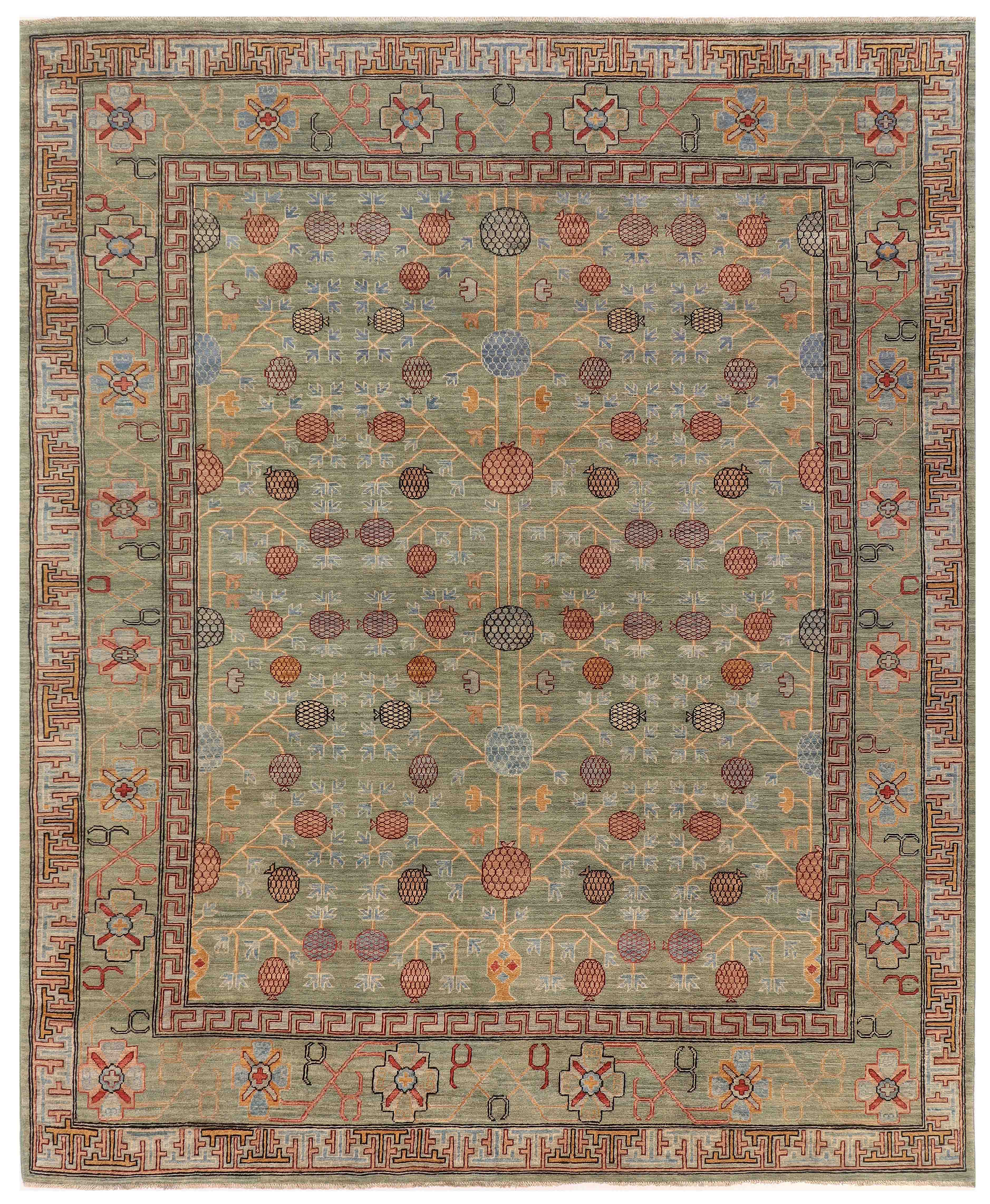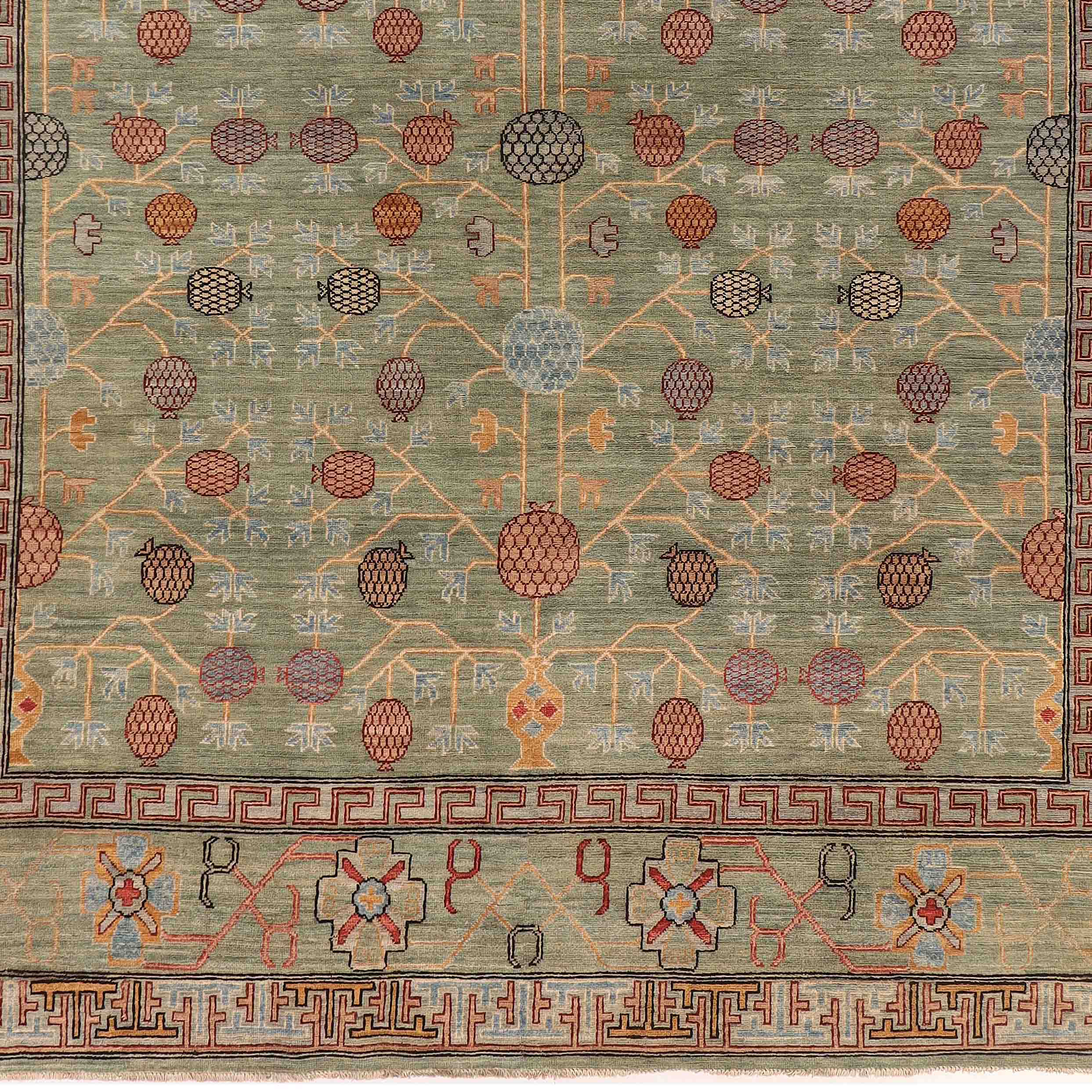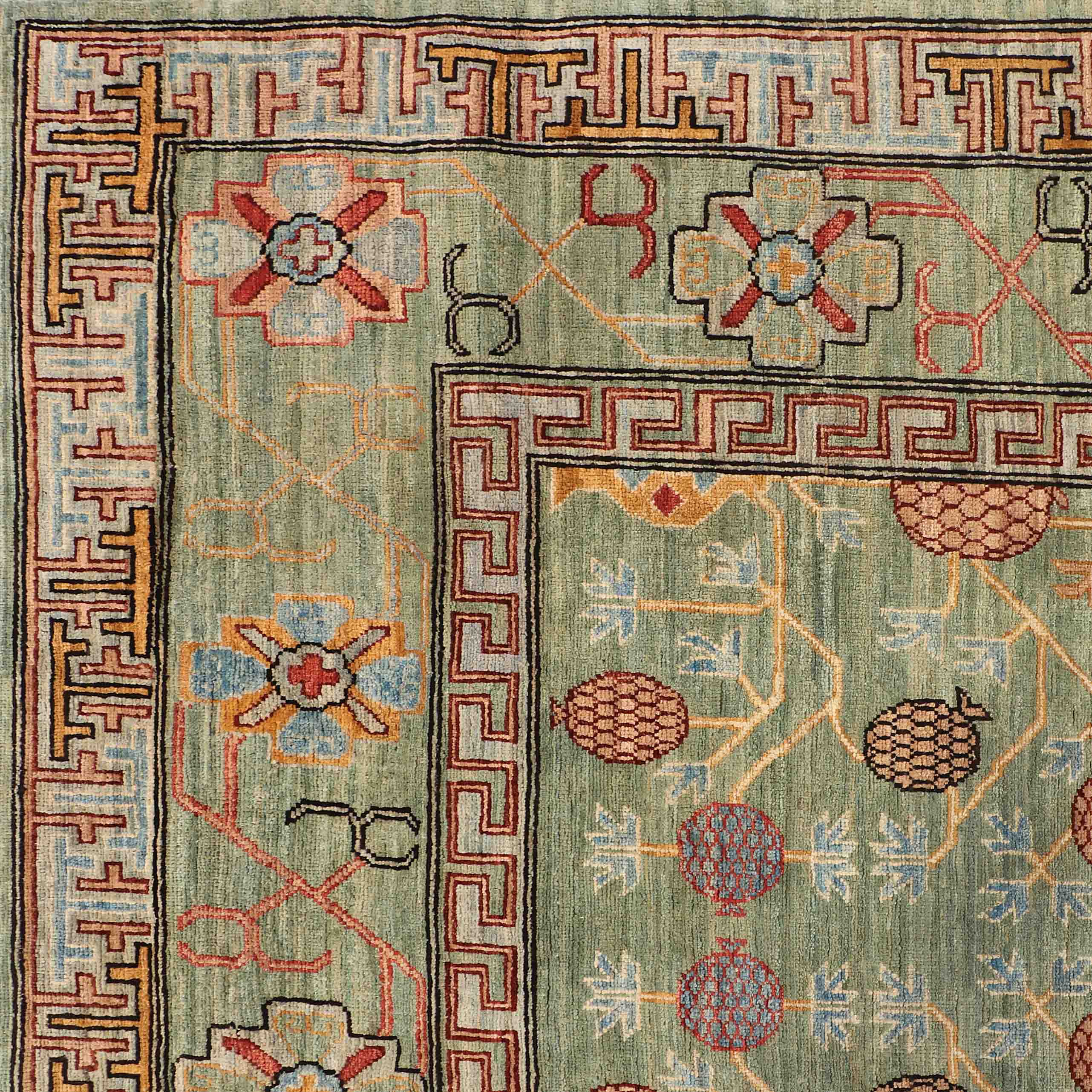 An Afghan Khotan rug is a hand-knotted creation drawing inspiration from antique designs native to the Khotan region, a historic oasis along the Silk Road now located in Xinjiang, China. Crafted in Afghanistan, frequently by Turkoman artisans, these rugs showcase a unique fusion of Chinese and Central Asian influences, emphasising geometric patterns and characteristic motifs such as pomegranates.
