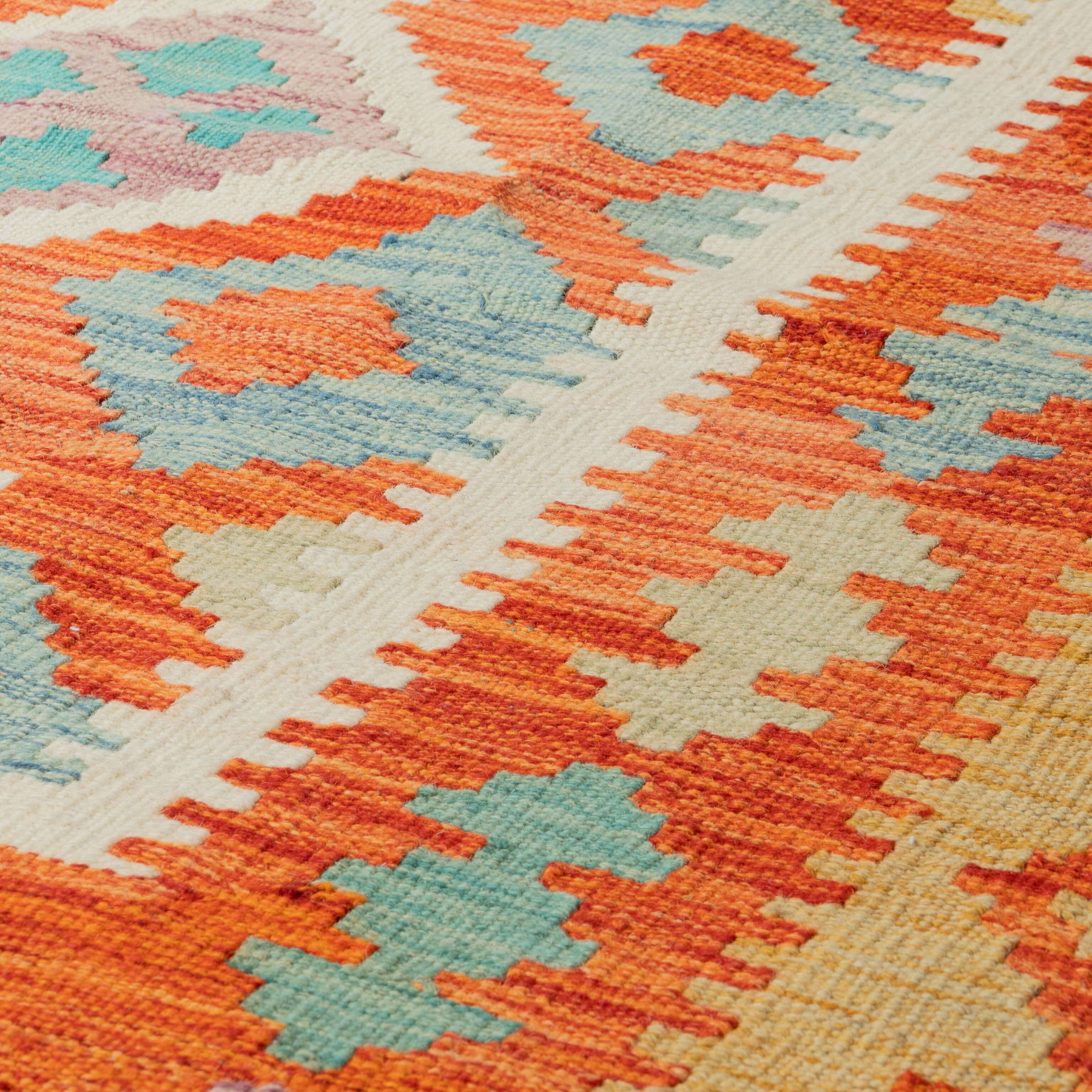 Experience the quality and tradition of Afghan craftsmanship with our handmade Kilim. This flat-weave kilim is woven from traditional, vegetable-dyed wool, making it durable and ideal for use with underfloor heating. Its colourful and striking design is reversible, allowing it to be used as a floor covering, wall hanging, or throw. Elevate your space with this stunning and affordable piece.