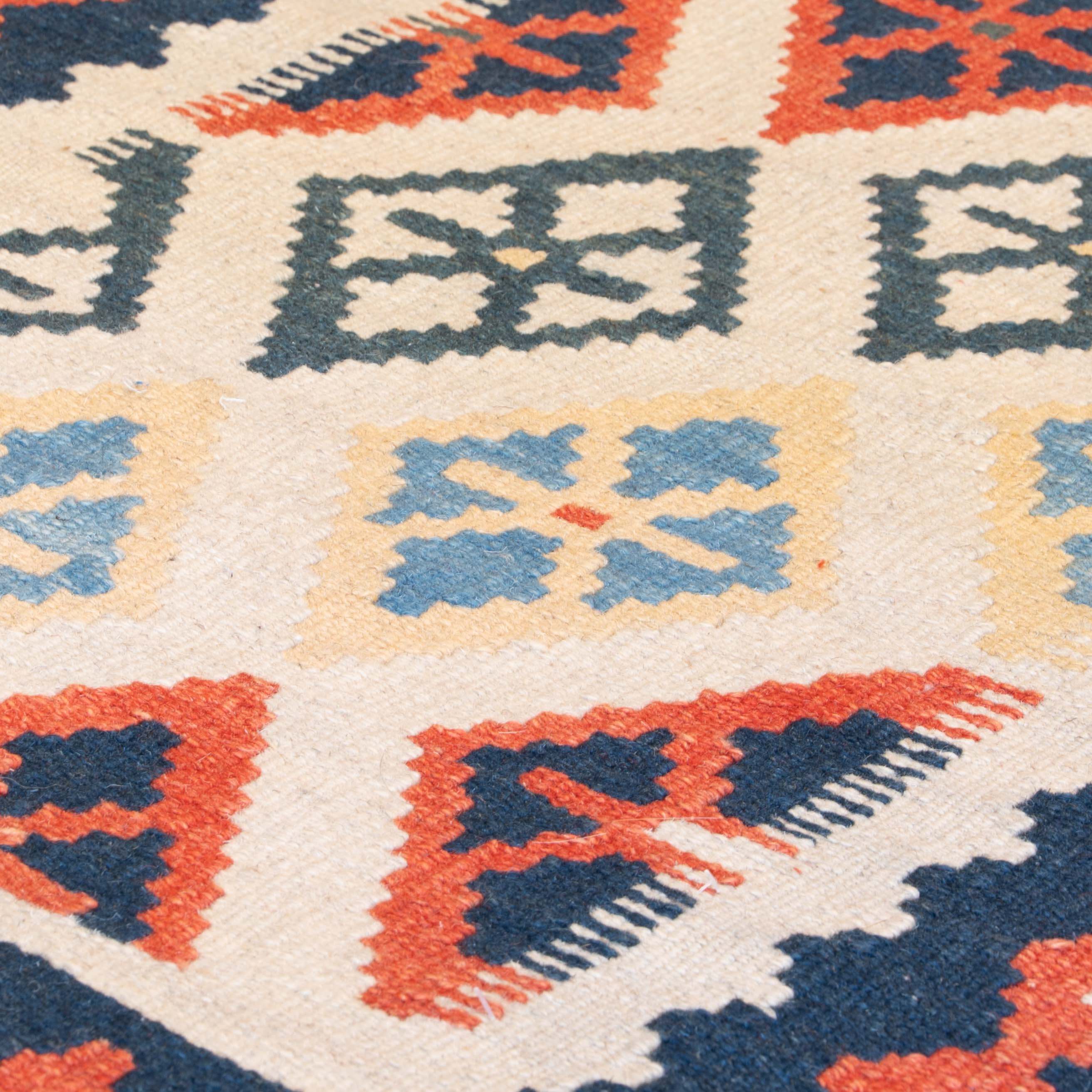 Experience the quality and tradition of Afghan craftsmanship with our handmade Kilim. This flat-weave kilim is woven from traditional, vegetable-dyed wool, making it durable and ideal for use with underfloor heating. Its colourful and striking design is reversible, allowing it to be used as a floor covering, wall hanging, or throw. Elevate your space with this stunning and affordable piece.