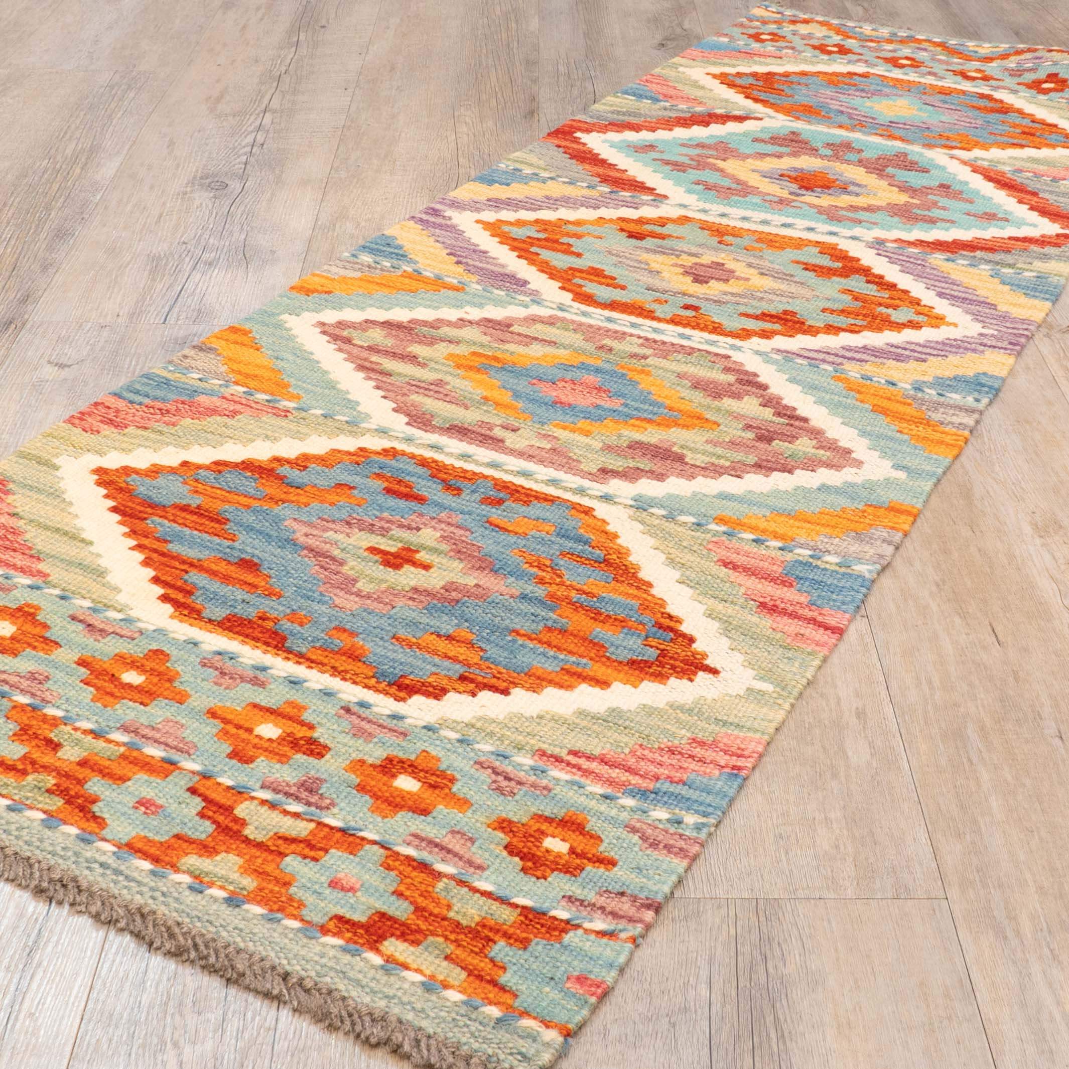 Experience the quality and tradition of Afghan craftsmanship with our bold geometric handmade short runner Kilim. This flat-weave kilim is woven from traditional, vegetable-dyed wool, making it durable and ideal for use with underfloor heating. Its colourful and striking design is reversible, allowing it to be used as a floor covering, wall hanging, or throw. Elevate your space with this stunning and affordable piece.         Please click the hyperlinks in gold if you are interested in additional information. Kilim rugs are serviceable and practical, offering the advantage of being made from one of the most beautiful natural yarns,...
