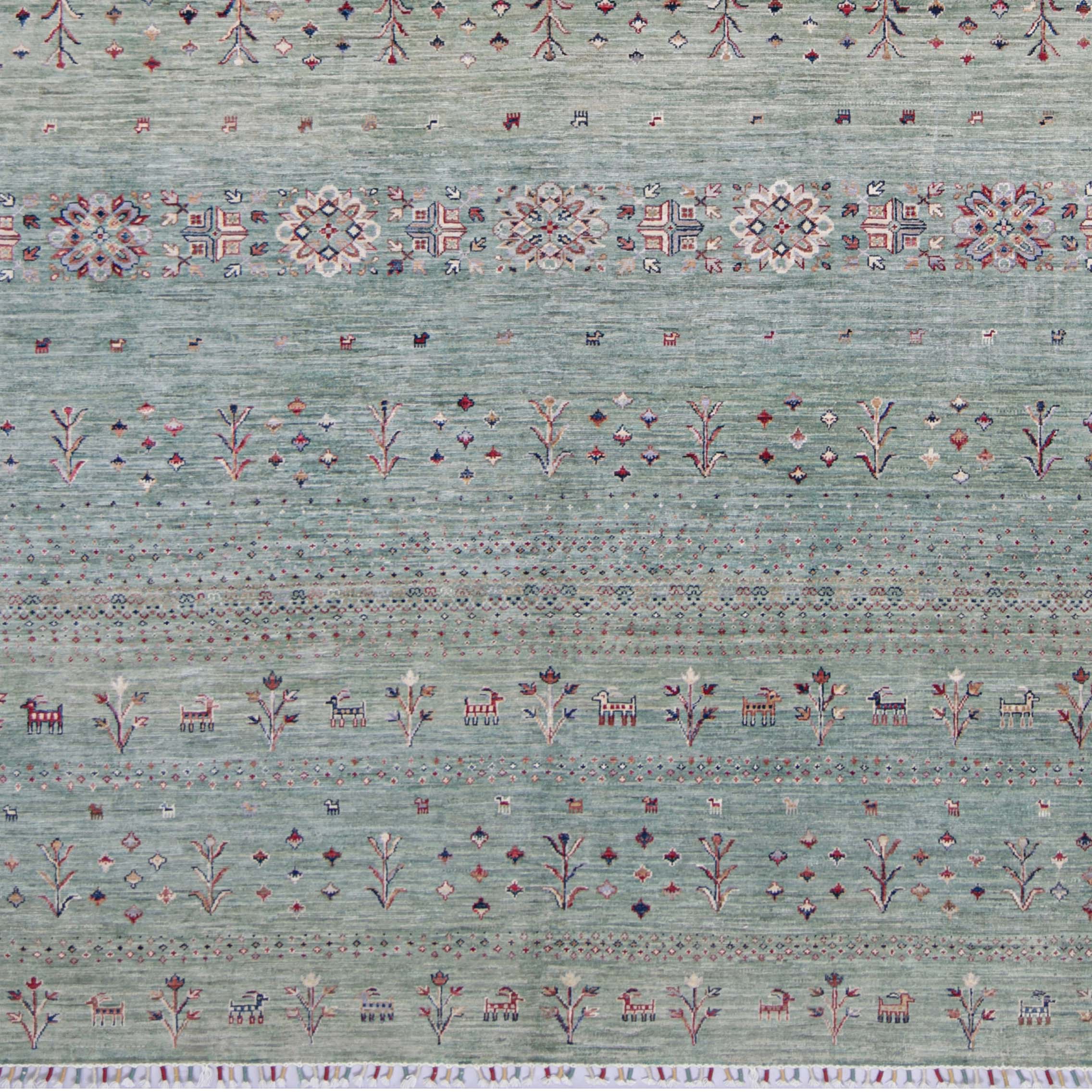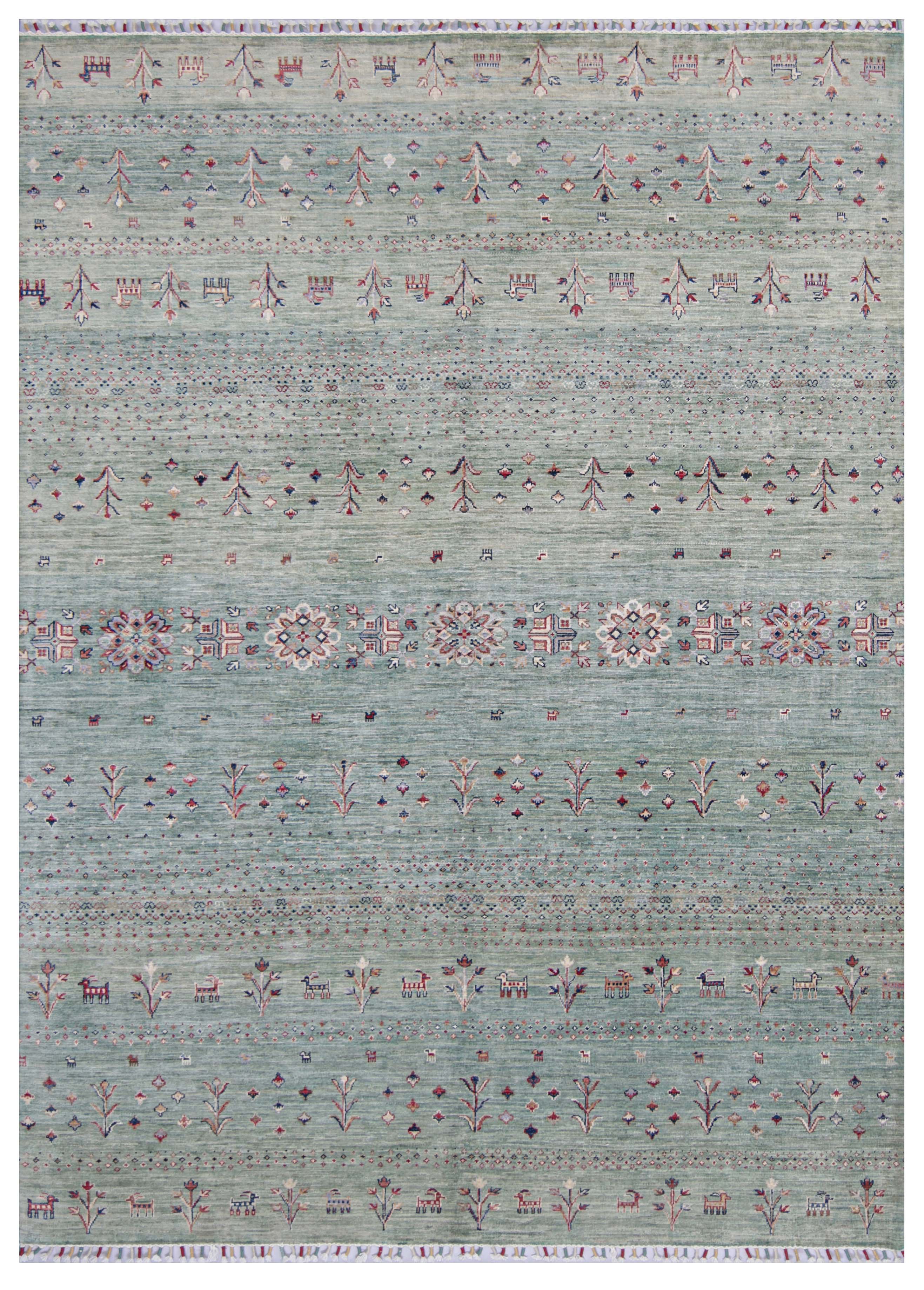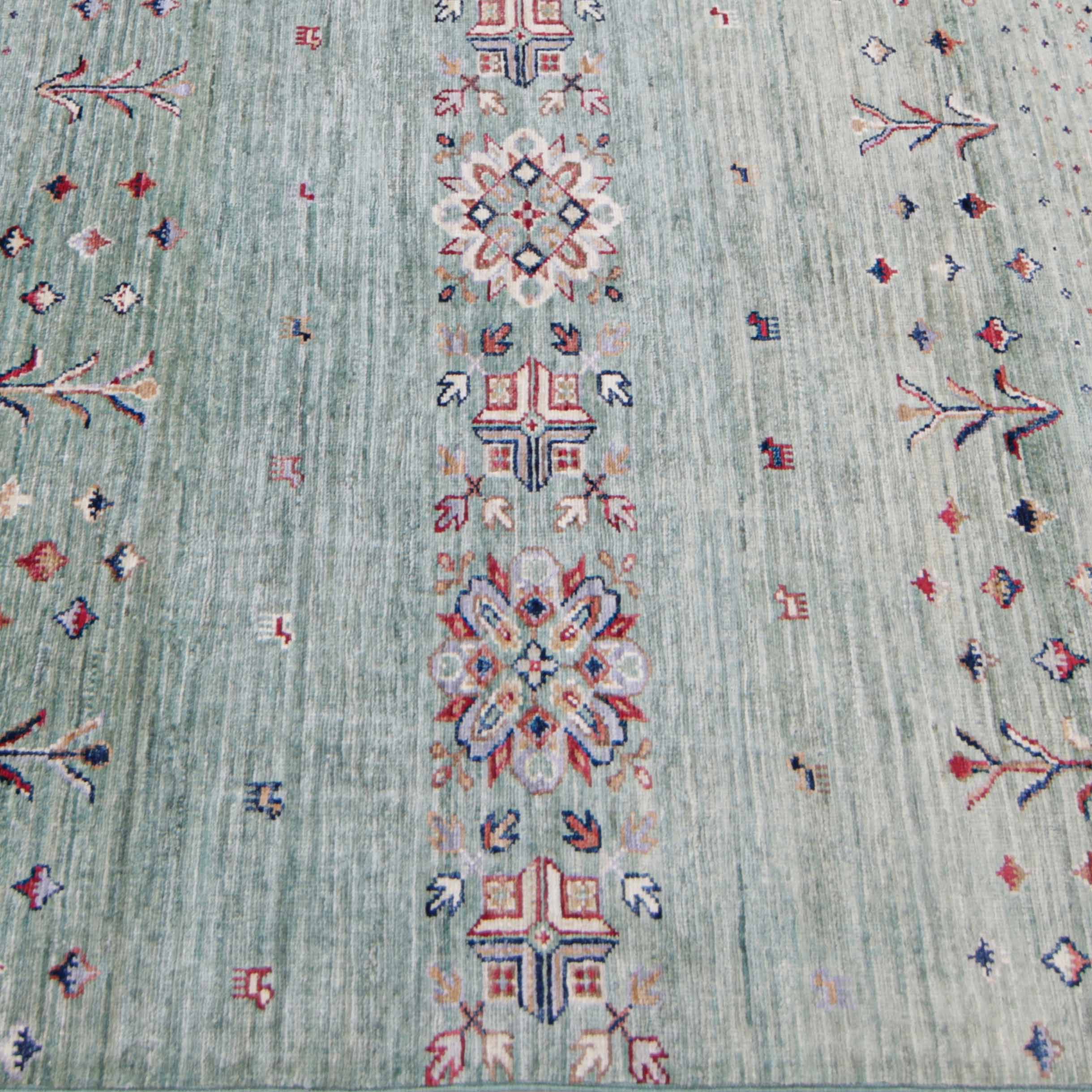 Crafted by skilled artisan weavers in north-west Afghanistan, this fine Loribaft carpet showcases traditional techniques passed down through generations. Made from vegetable-dyed handspun wool, it features a soft, subtle green background adorned with delicate motifs. Durable and hard-wearing, it suits any room while adding a refined, contemporary touch to your home décor.