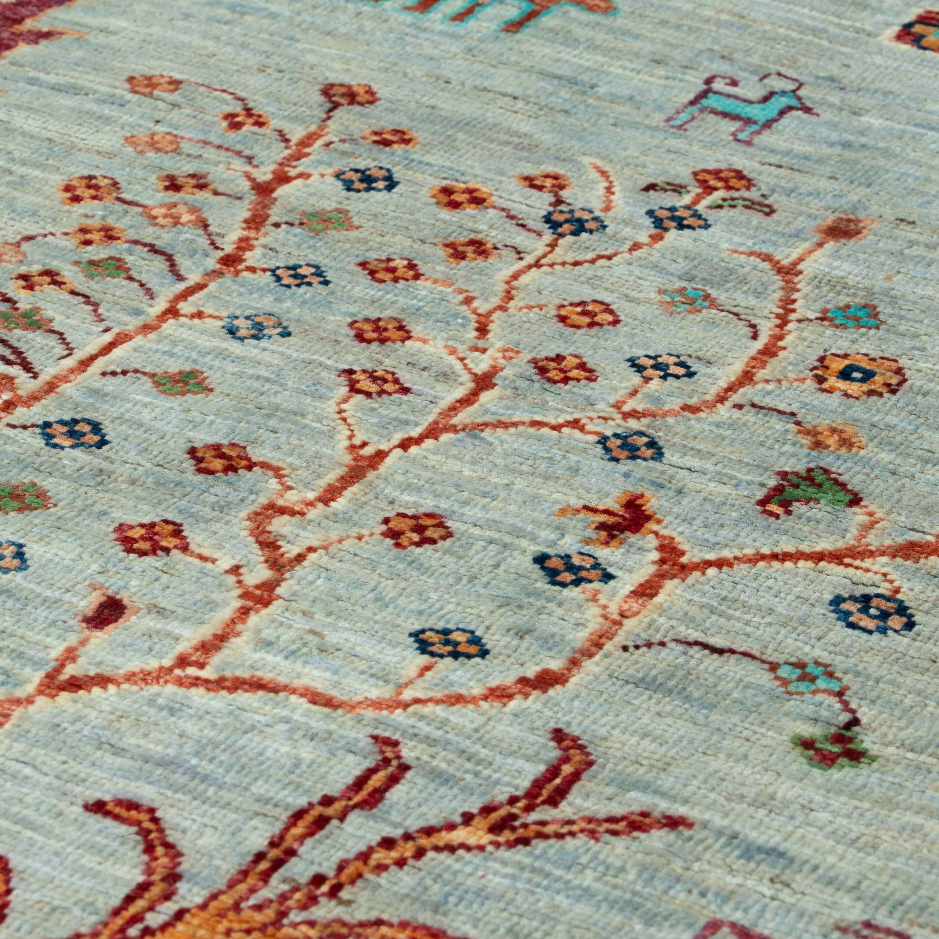 This Afghan Loribaft has a lovely modern colouring and a simple tree design. The grey background showcases the wine red, navy blue, peach, and green, and even features turquoise touches. The design has many quirky, stylised birds, including peacocks and goats. This is what we refer to as a functional art piece.