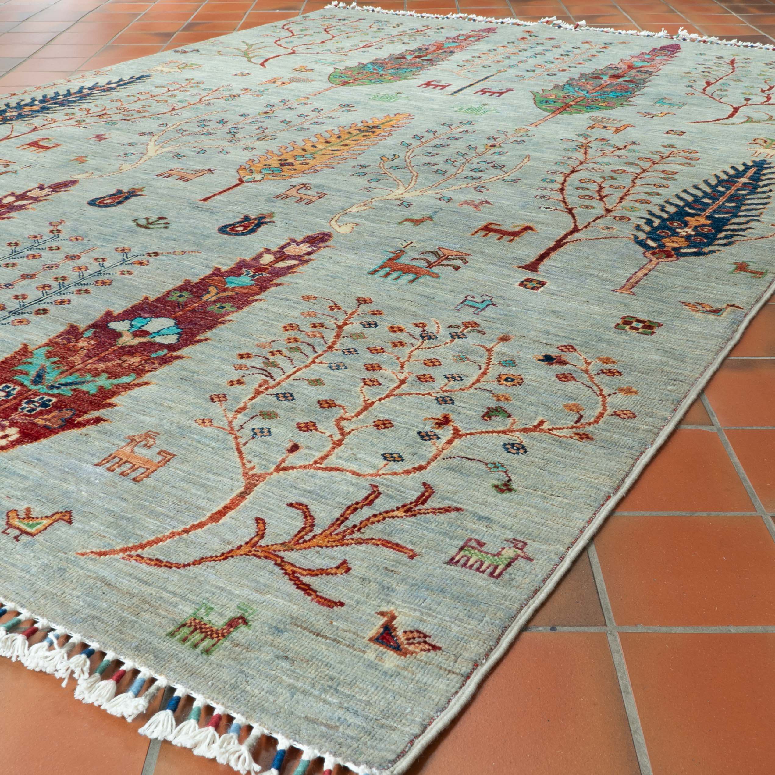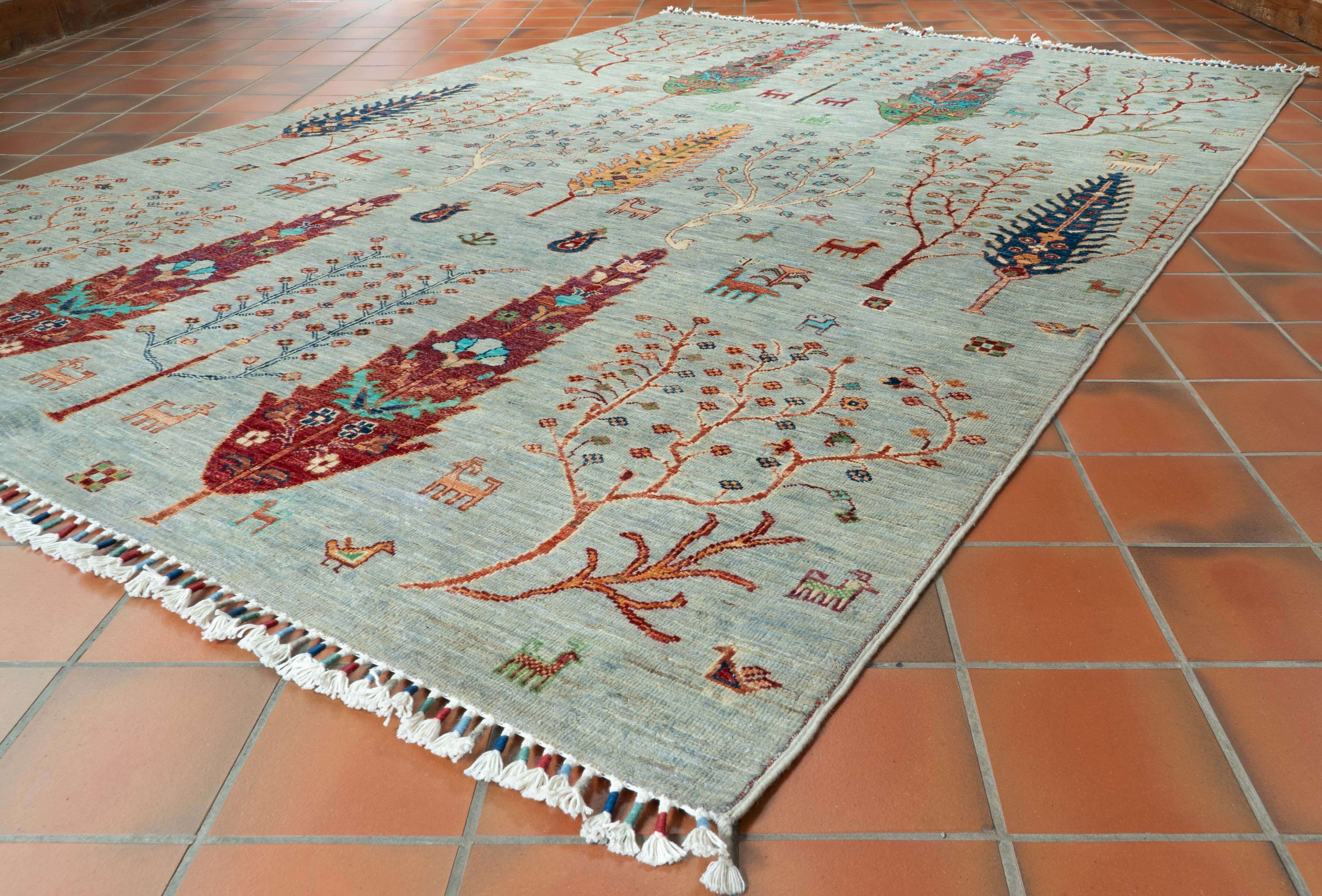 The carpets are still hand-knotted, and the wool is coloured with vegetable dye. The Loribaft rug designs can be reminiscent of Gabbeh designs, although the Loribaft pieces are more refined and tightly knotted. The colours of the Loribaft rugs and carpets are similar to those used in our Samarkand collections and possibly more vibrant. The main distinction is that the patterns are playful, using a defined colour palette and simple design, with stylised animals, plants, trees, or characters featuring block colours that often mimic an ombre effect. Some Loribaft pieces do not have fringes, so they are finished with a plain kilim end or binding and secured to prevent fraying. Like the Samarkand carpets, other rugs are produced with an unusual bobbin wind on the warps.