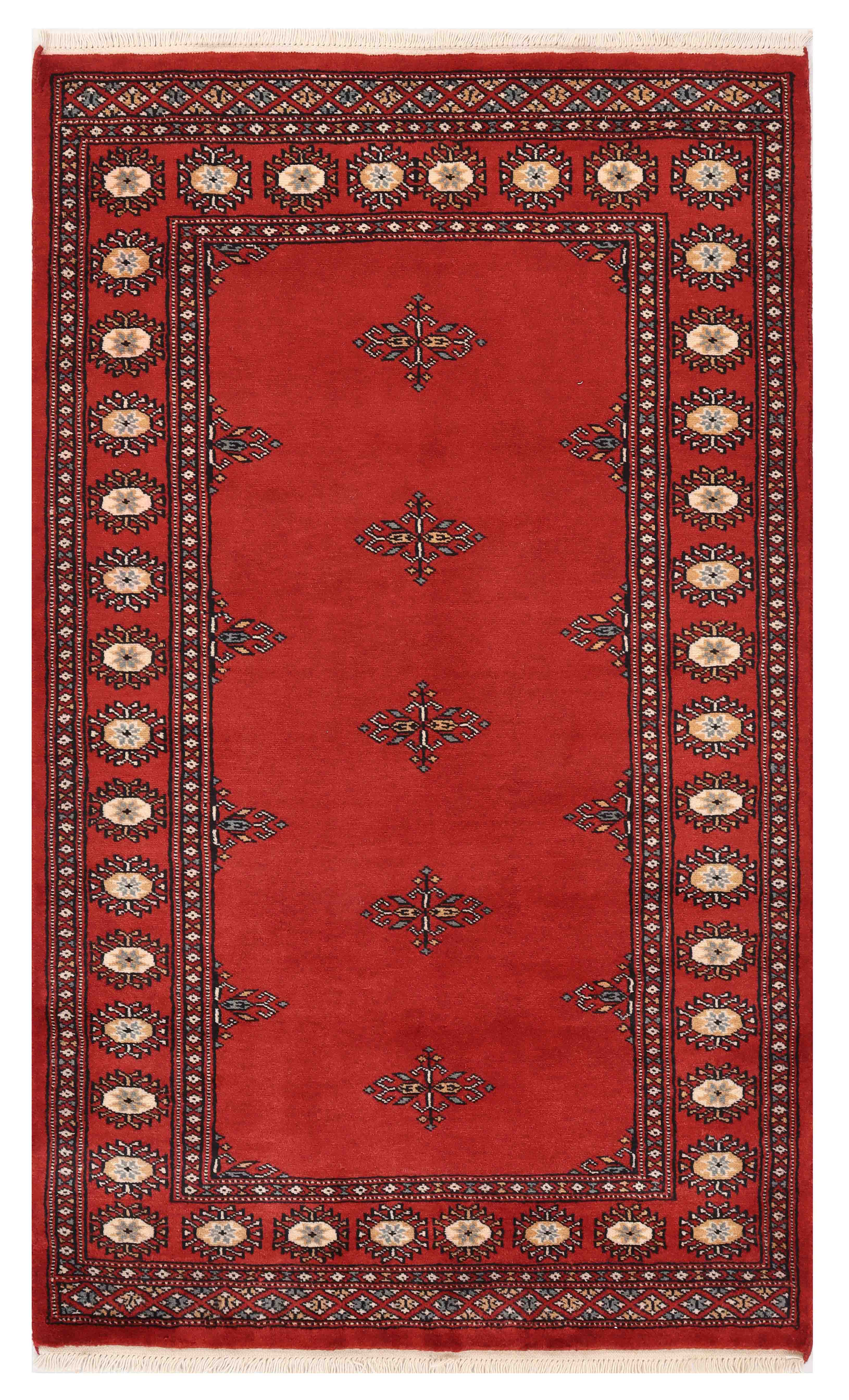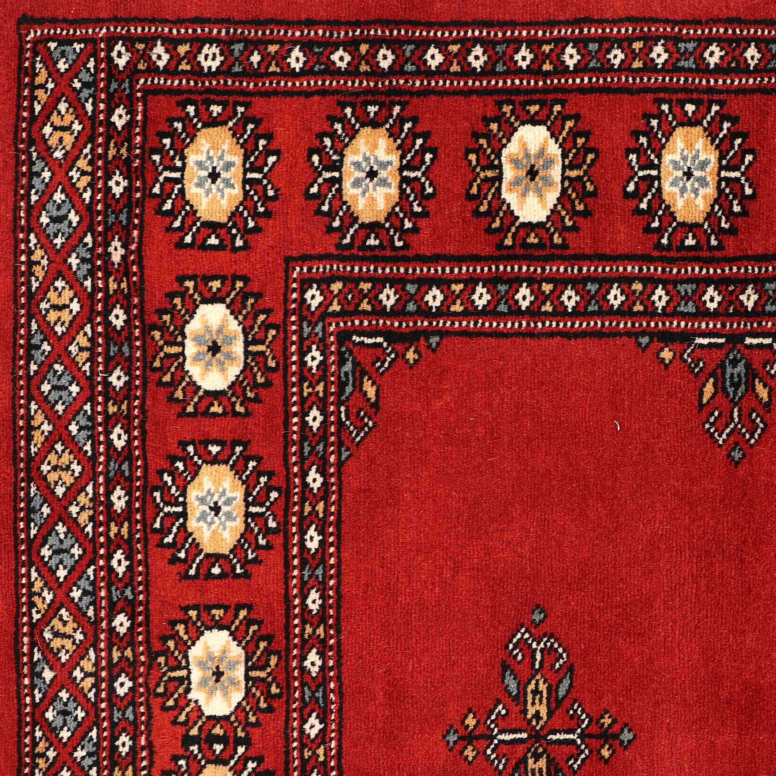 The well-known Bokhara design originates from Uzbekistan, where the nomadic Turkoman tribespeople first took their rugs to be sold. The repetitive octagonal motif, known as a "gul" (Persian for "rose"), is a characteristic feature of Bokhara rugs. Today, Pakistani people weave this design in a wide range of colours and sizes.