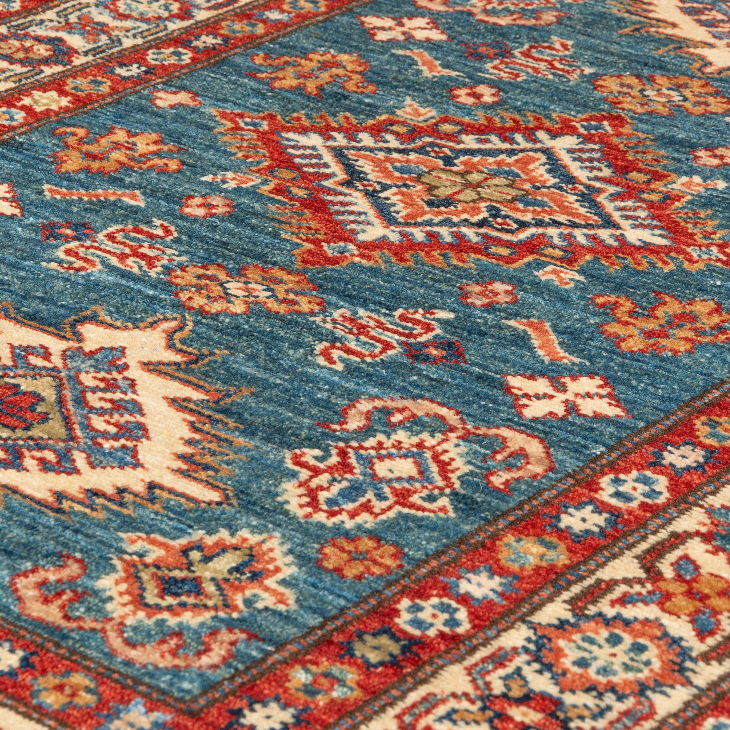 Handcrafted in northwest Afghanistan by skilled artisan weavers, this Fine Afghan Kazak rug showcases time-honoured techniques passed through generations. Made from vegetable-dyed handspun wool, it features a traditional geometric design inspired by classic Caucasian motifs. The striking teal background is complemented by rich reds, apricot, and cream tones, creating a unique and vibrant palette. Durable and practical, this rug combines fine quality with a beautiful lustre to its pile, making it both an elegant and hardwearing addition to any space.