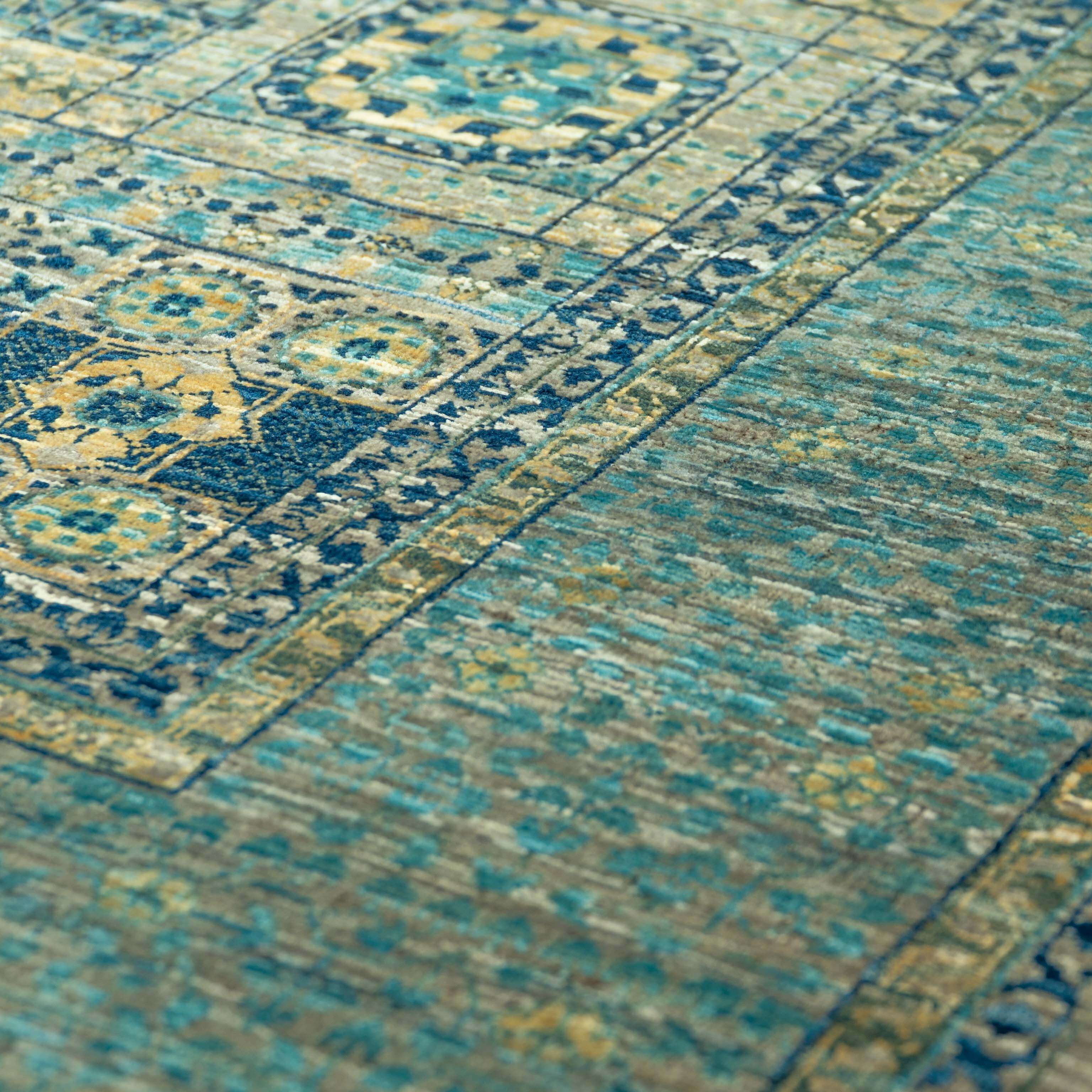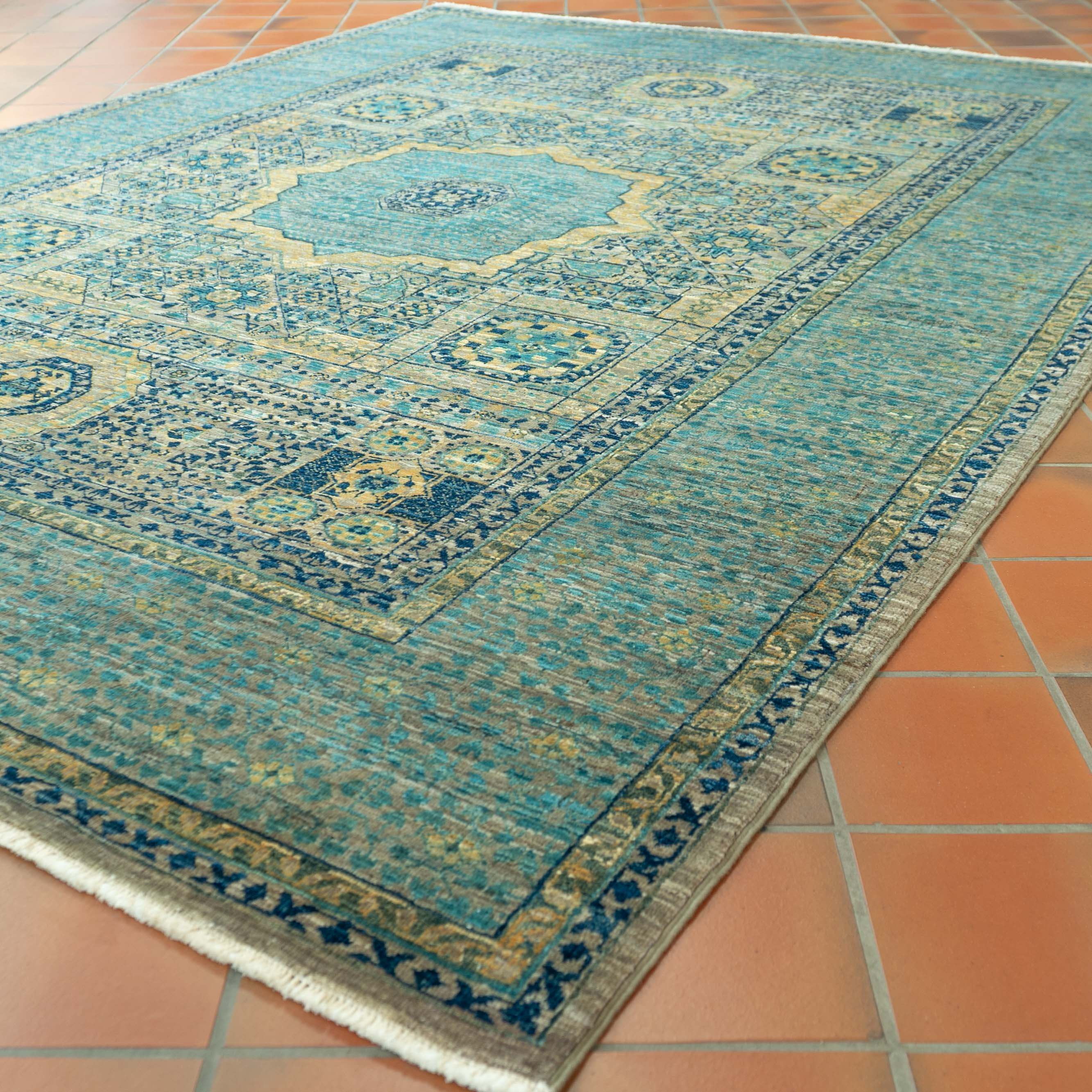 This exceptional Afghan Mamluk rug represents the pinnacle of traditional weaving craftsmanship. Handwoven by skilled artisans working within a cottage industry, each piece embodies generations of inherited expertise and time-honoured techniques. The rug features a striking central medallion design inspired by classic ancient Egyptian motifs, rendered with intricate complexity throughout. Crafted from handspun wool, dyed with natural vegetable dyes in rich blue tones accented with warm gold, the rug showcases exceptional quality through its fine knotting and dense pile. This combination of superior materials and meticulous workmanship ensures both aesthetic beauty and remarkable durability, making it a practical investment that...