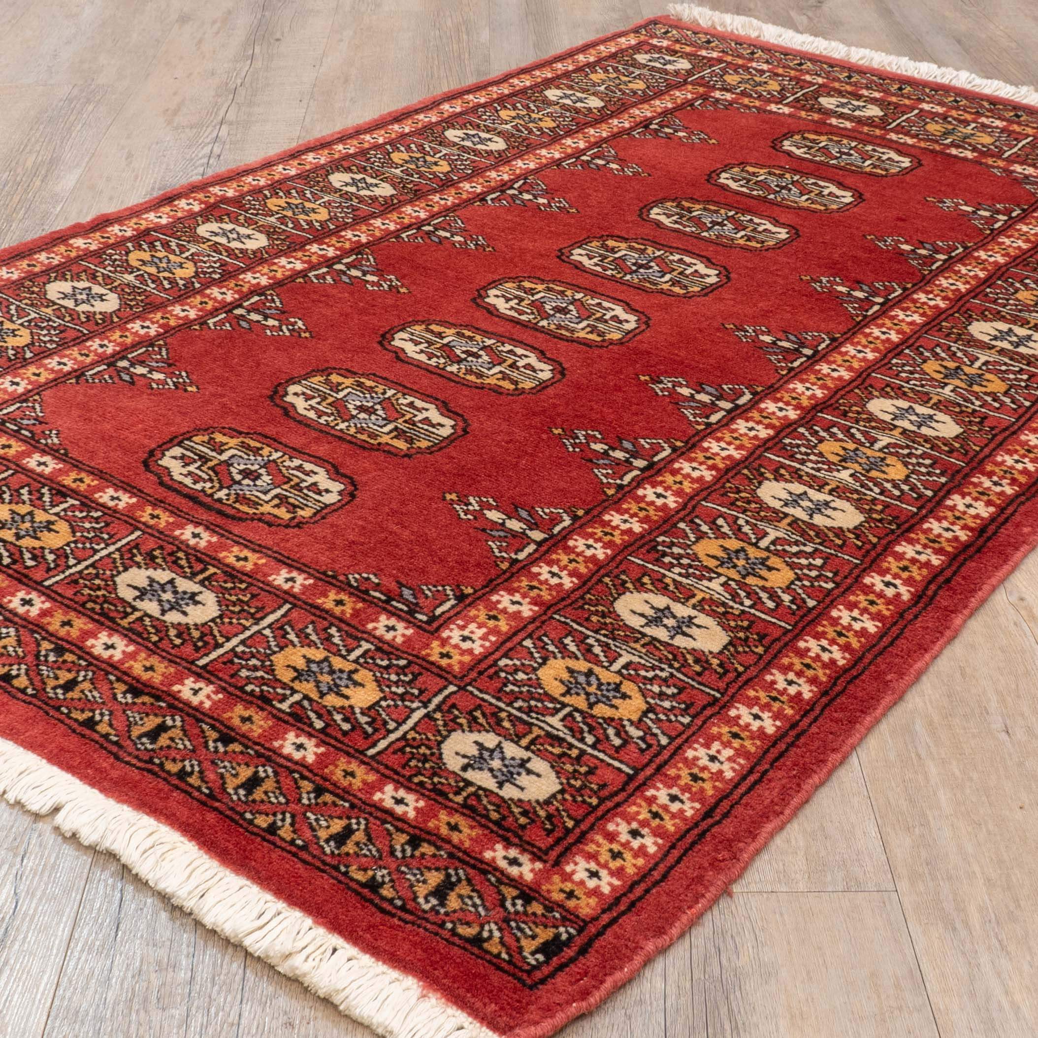 This Pakistan Bokhara rug is finely knotted in a traditional design using lovely, soft, silky wool. The Bokhara rugs are always made with a wool pile, but unfortunately, some people try to pass them off as silk. Handmade Bokhara rugs offer excellent value.