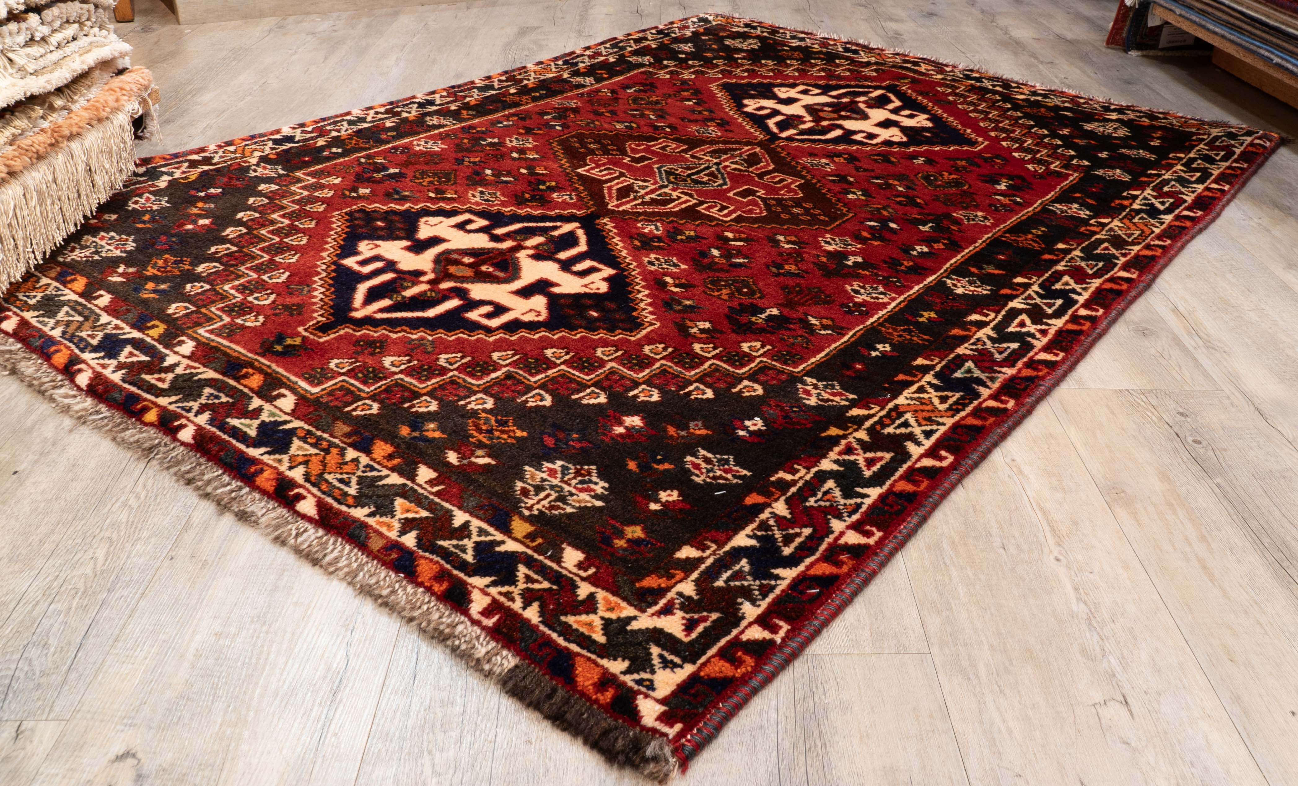 This authentic Qashqai rug is handwoven by nomadic artisans in southern Iran using time-honoured techniques. Crafted from 100% vegetable-dyed wool with a luxuriously deep pile, it features a striking traditional design centred around three medallions in rich red, black and cream tones. Each piece showcases the distinctive character and individuality inherent in handmade textiles. Built to withstand everyday use, this hard-wearing rug combines practical durability with genuine artisanal craftsmanship, making it a distinctive addition to any interior.