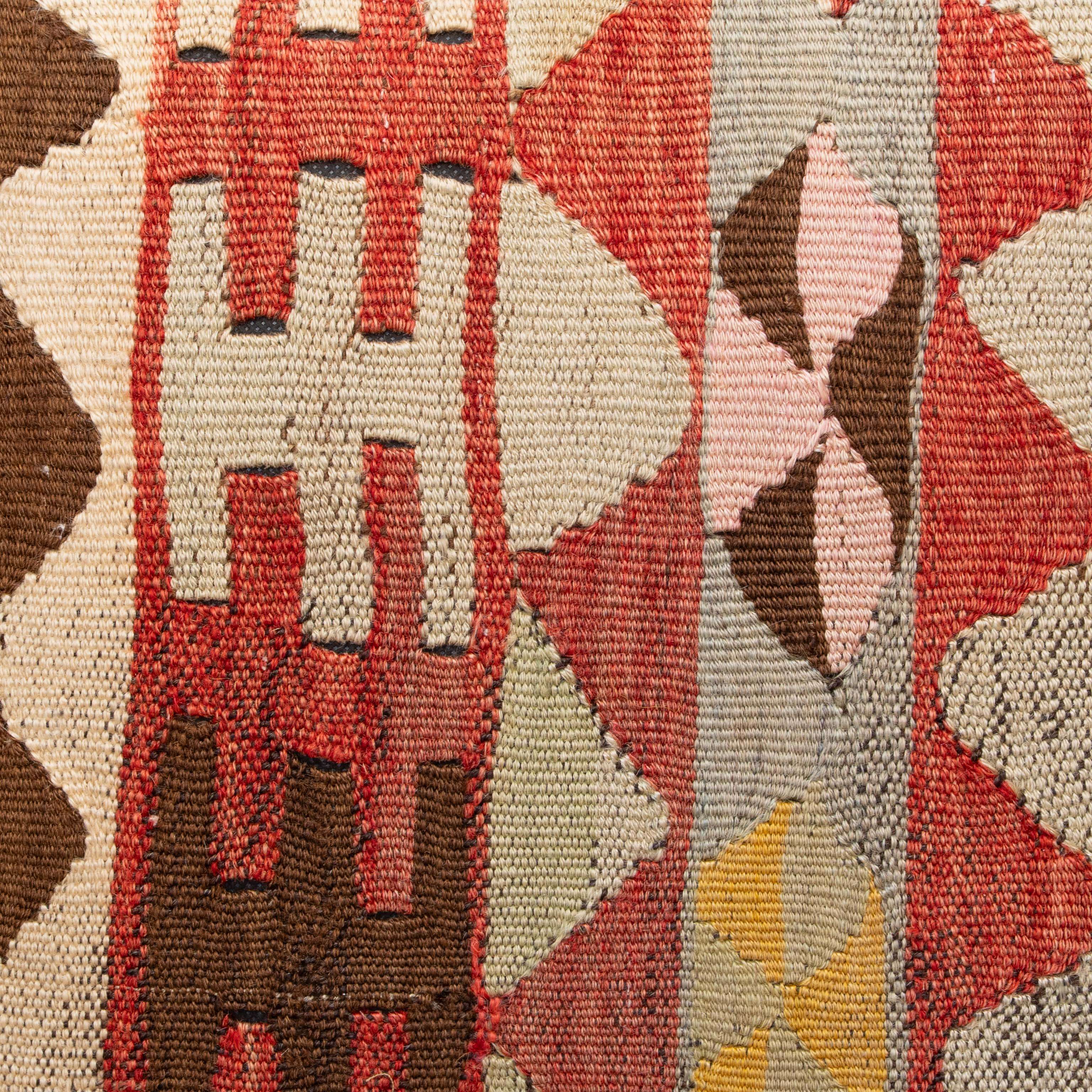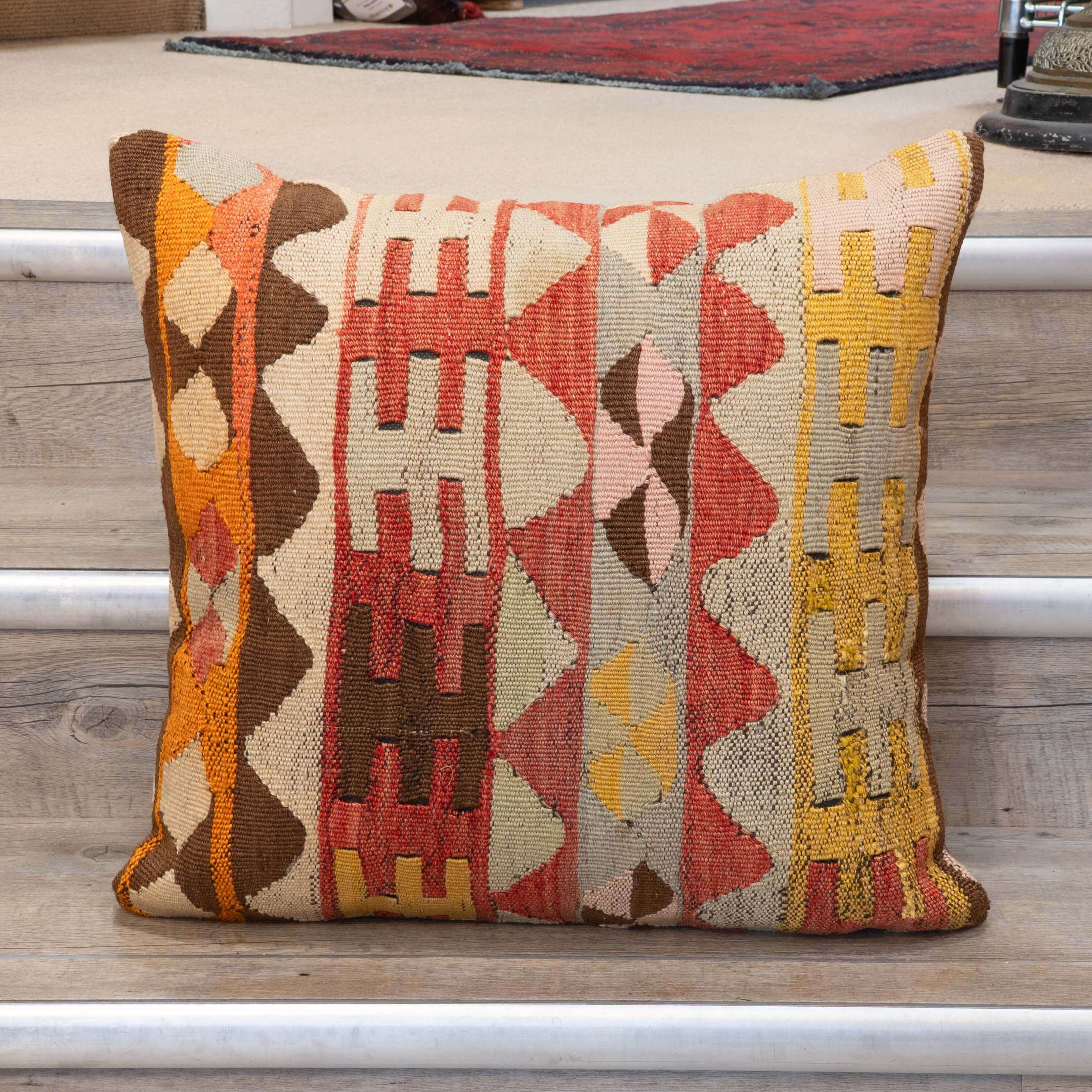 Our collection of kilim cushions offers great colours, designs and textures. The pieces are often taken from a larger old, sometimes antique kilim, cleaned and sorted to repurpose and salvage a treasured fabric that otherwise could be lost. The pattern may be cut in unusual and interesting ways to ensure as much of this precious resource can be saved. In addition, the cushions are fibre-filled, making them more suitable for individuals with allergies to feather fillings.