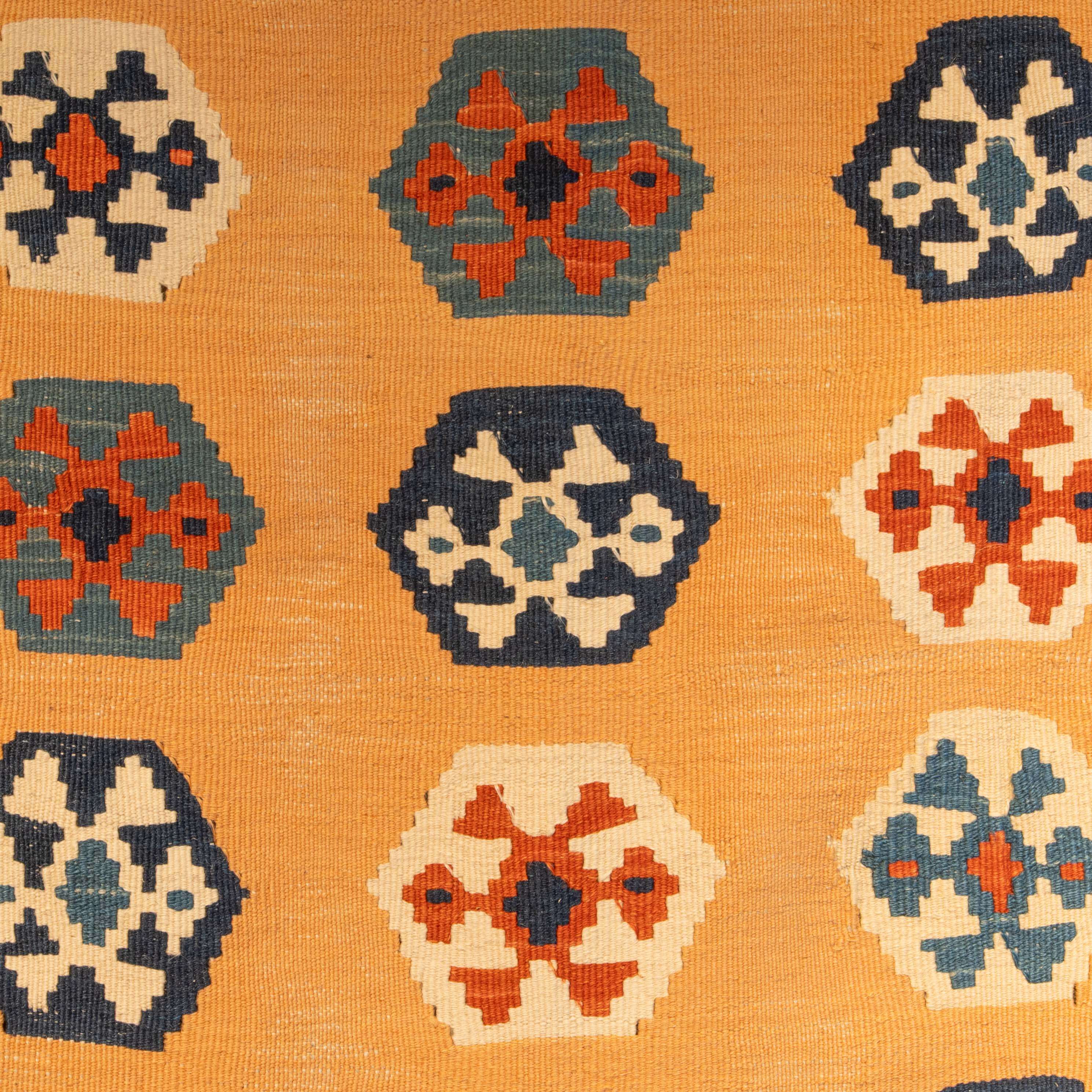 Discover traditional Qashqai craftsmanship in this colourful handwoven kelim. Rich blues, greens, and terracotta tones blend seamlessly across traditional geometric patterns that tell a story of cultural heritage. Crafted entirely from 100% wool, this reversible textile adapts to your décor—flip it to refresh your space instantly. Durable enough for everyday use yet refined enough to become a focal point, it's the perfect choice for those who value genuine artisanal quality and timeless design over mass-produced alternatives.  Please click the hyperlinks in gold if you are interested in additional information. The Qashqai tribal confederation comprises five major tribes: Dareshuri, Farsimadan, Sheshboluki,...