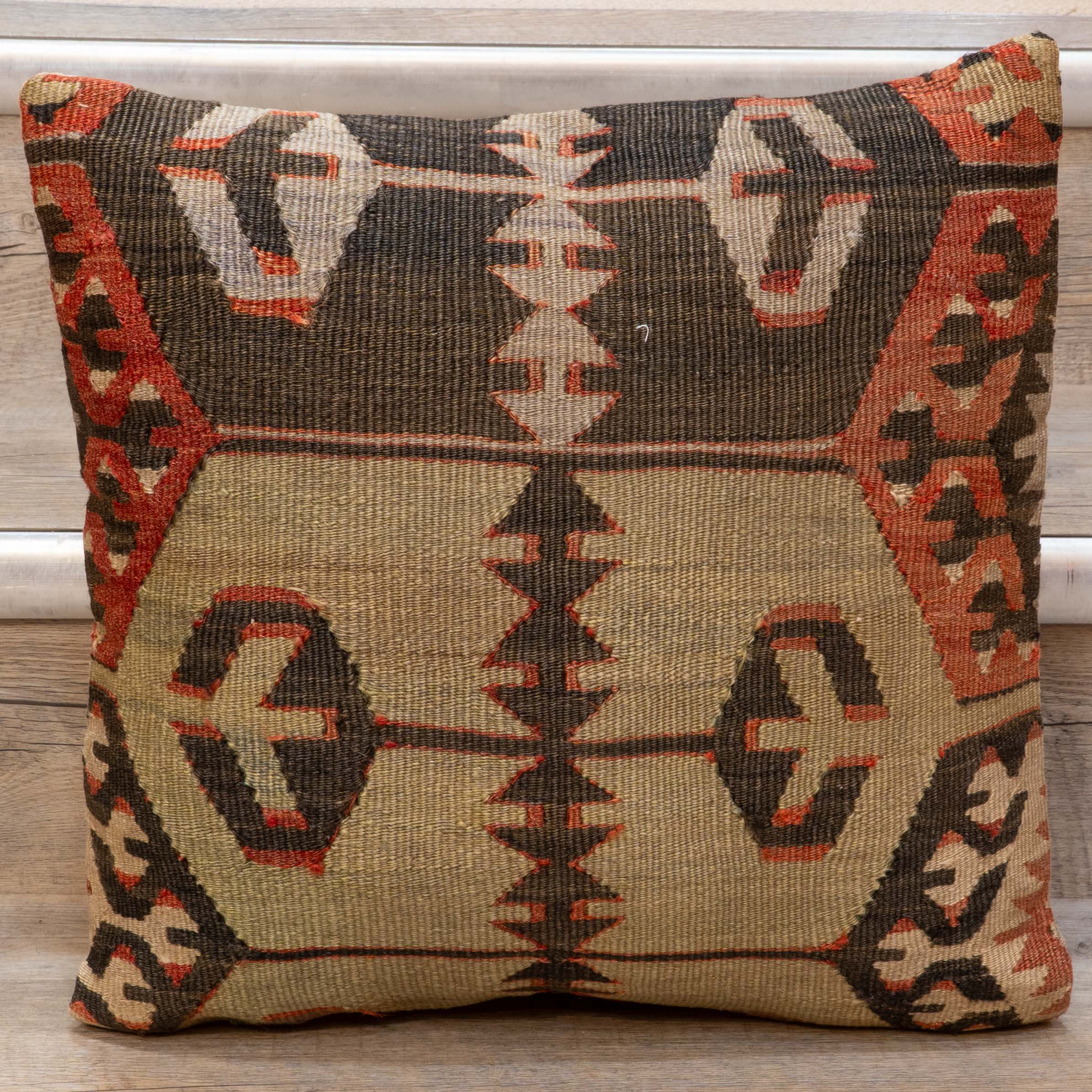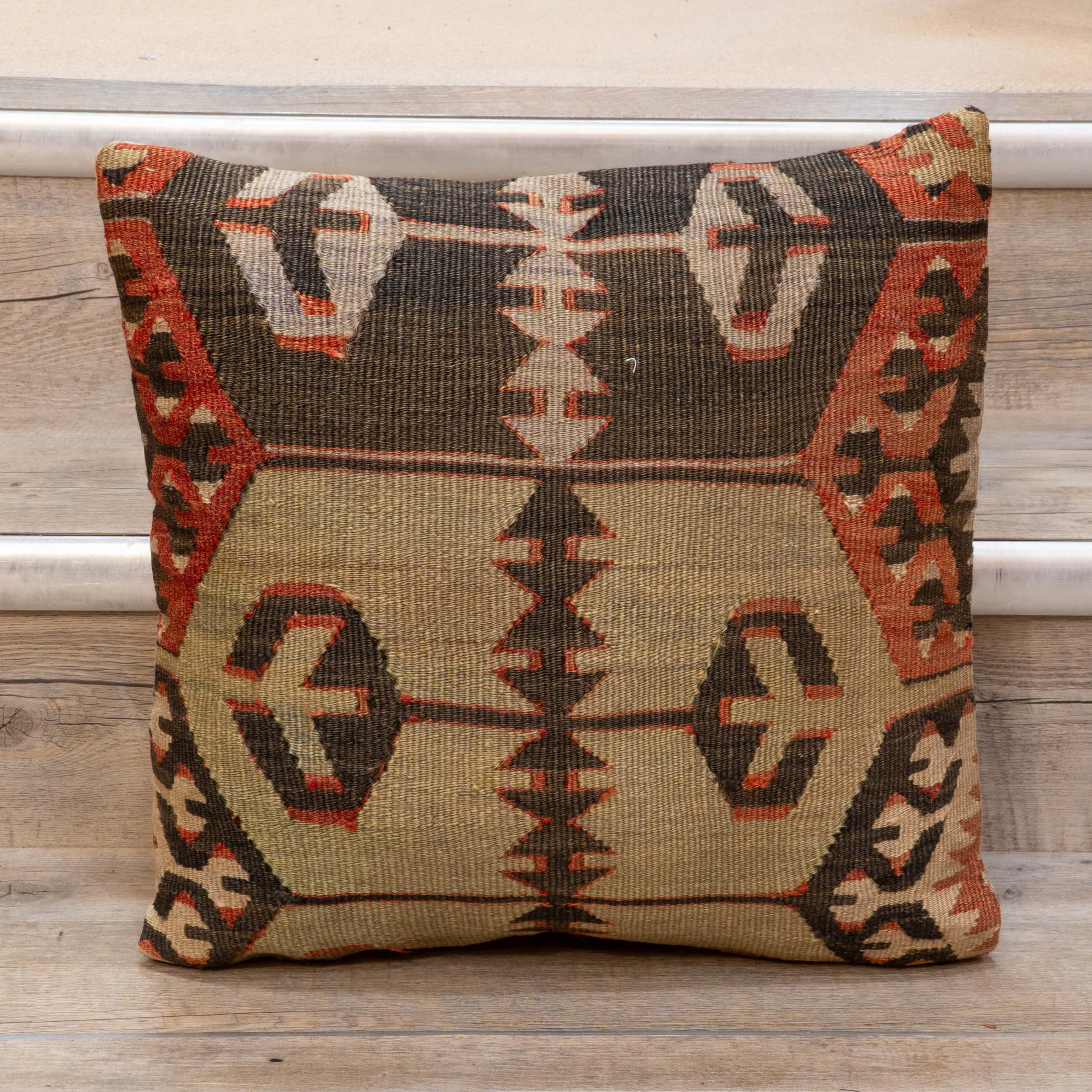 Our collection of kilim cushions offers great colours, designs, and textures. The pieces are often taken from larger old kilims, sometimes antiques, and cleaned and sorted to repurpose and salvage a treasured fabric that would otherwise be lost. The pattern may be cut in unusual and interesting ways to ensure that as much of this precious resource as possible is saved. In addition, the cushions are fibre-filled, making them suitable for individuals with feather allergies.  Product size:   40 x 40cm (1'4 x 1'4)