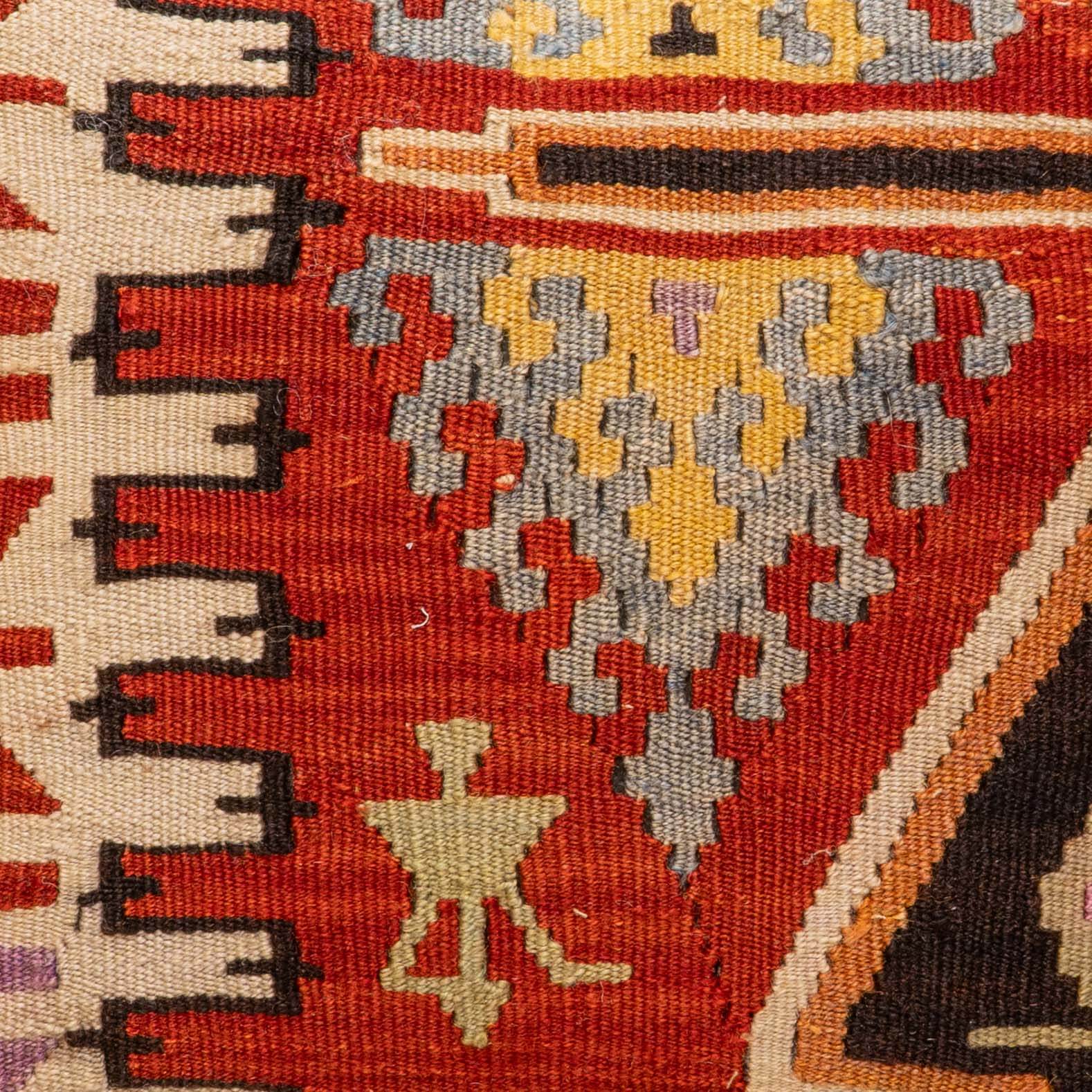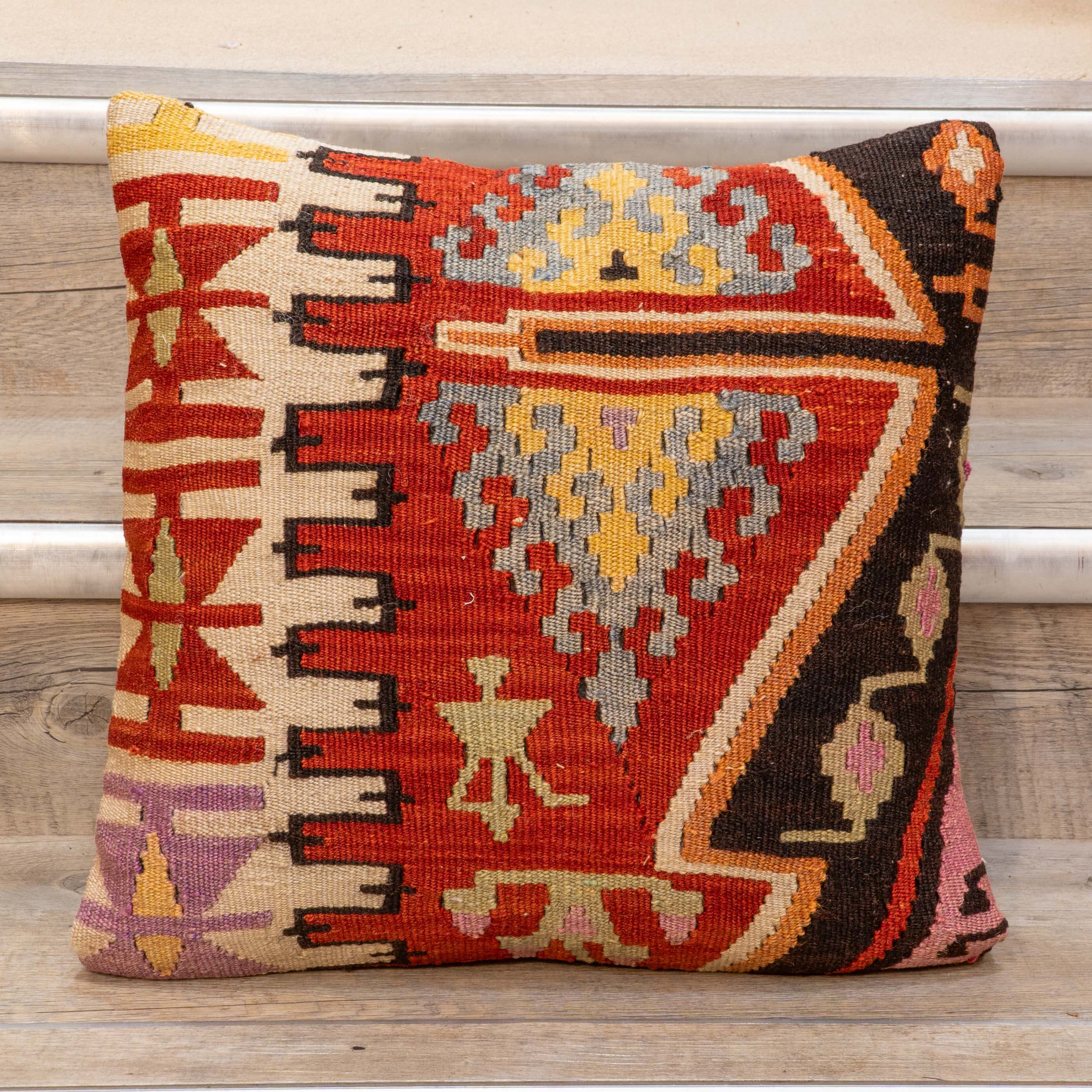 Our collection of kilim cushions offers great colours, designs, and textures. The pieces are often taken from larger old kilims, sometimes antique, and cleaned and sorted to repurpose and salvage a treasured fabric that would otherwise be lost. The pattern may be cut in unusual and interesting ways to ensure that as much of this precious resource as possible is saved. In addition, the cushions are fibre-filled, making them suitable for individuals with feather allergies.  Product size: 40 x 40cm (1'4 x 1'4)