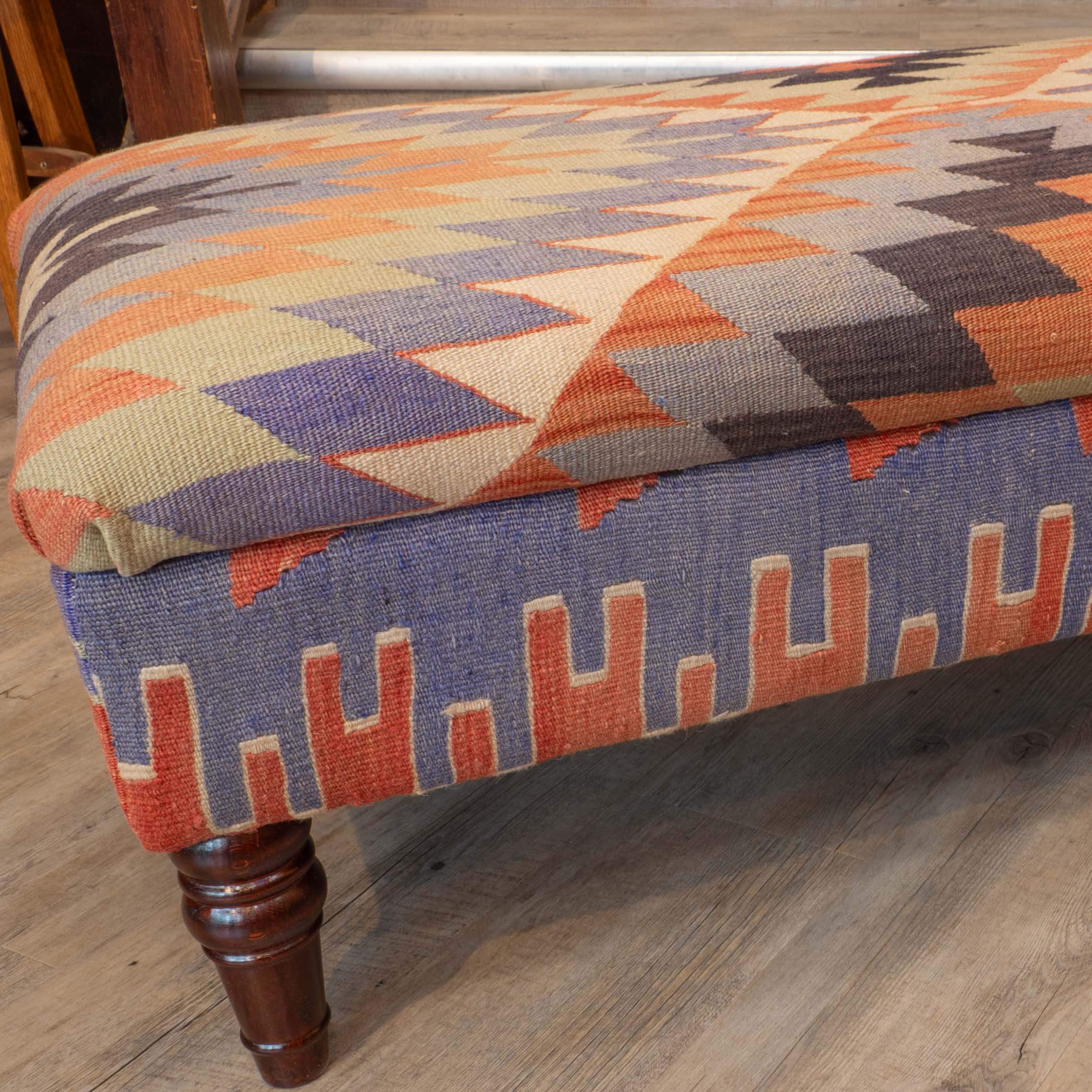 This soft coloured ottoman, with a traditional geometric design from Turkey, adds a touch of sophistication to any room. The muted colours of pale lilac, soft green, fawn,and a subtle terracotta create a stunning visual. Use it as extra seating, storage, or a stylish footrest, or even a coffee table. The beautifully lined and firm upholstery makes this ottoman a piece of furniture in its own right.   Please click the hyperlinks in gold if you are interested in additional information.Salvaged Kilim rugs are usually used to produce these pieces—particularly old Turkish kilim, which often has lovely motifs with meanings. Vegetable-dyed wool is a...